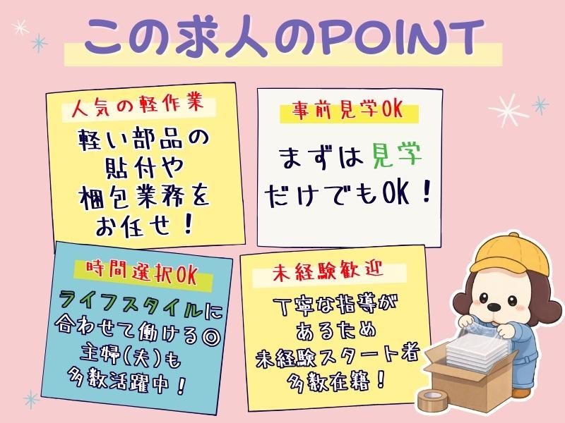 求めている人材 \経験・年齢不問!/ <こんな方にピッタリ!> ・家事や育児と両立して働きたい方 ・接客よりも、コツコツ進める裏方作業が好きな方 ・体力的な負担が少ない仕事を探している方 ・ブランクから復帰したい方 <活躍中のスタッフさんの声> 「覚えることも少なく、最初の1週間で慣れました! モクモク作業が好きな人には本当に向いてると思います!」