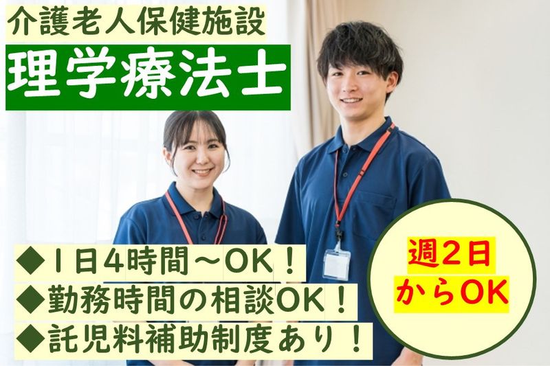 【アピールポイント】 介護老人保健施設の理学療法士を募集! ■週2日から勤務OK! ■託児料補助制度あり! ■勤務時間の相談OKです!