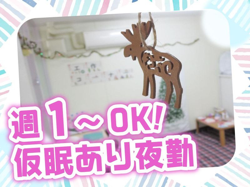 職場環境 10代から40代まで幅広い世代が活躍 しています。分からないことはすぐに 聞ける環境なので安心してください! 夜勤は保育士を目指している学生さんが メインで活躍しています★ 喫煙所:なし(敷地内全て禁煙)