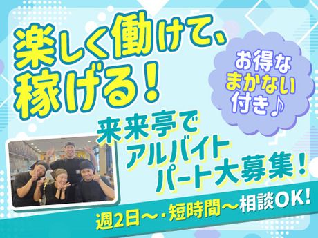 資格 ★未経験者大歓迎!飲食店経験は一切不要 ★経験者の方ももちろん歓迎! ★主婦(主夫)歓迎 ★WワークOK! ★学歴不問 ★扶養内勤務OK ★中高年の方も活躍中! ★ブランクのある方も歓迎 ★アルバイトから正社員を目指したい方も大歓迎 【来来亭の三大原則】 「大きな声での挨拶」 「ニコニコ笑顔で対応」 「キビキビとした行動」 この3つを大切にし、お客様に「また来たい!」と思ってもらえるお店作りを目指しています。 「大きな声や笑顔、キビキビした動きに自信がない…」という方も安心してください。 最初は誰でもできません!先輩がしっかりサポートしますので、安心してスタートできます。 【スタッフの前職例】 コンビニ、カフェ、居酒屋、レストラン、工場、軽作業など、さまざまな前職を持ったスタッフが活躍中! 「家が近い」「ラーメンが好き」「高収入だから」など、動機は何でもOK! 【特別なスキルは一切不要】 ラーメン屋での経験や知識は全く必要ありません。 「稼ぎたい」「飲食店で働いてみたい」など、まずはやってみたいという気持ちがあれば大歓迎!