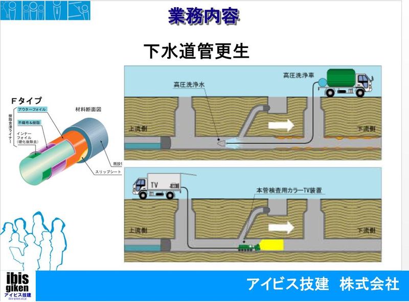 仕事内容 ◆環境工事事業部作業員◆ ✅エッセンシャルワーカーとして  ̄ ̄ ̄ ̄ ̄ ̄ ̄ ̄ ̄ ̄ ̄ ̄ ̄ ̄ ̄ ̄ 市民の生活を守る仕事です。  ̄ ̄ ̄ ̄ ̄ ̄ ̄ ̄ ̄ ̄ ̄ ̄ 埋設管カメラ調査や水中ドローンも使用し、 下水道等の延命化や耐震化も行っています。 下水道工事(管工事) ↪下水道管内に延命化の管を敷設したり、 特殊工事、下水道の延命や耐震化工事等。 誰でも最初は未経験です!みんなプロフェッショナルへと成長します 【当社の由来】 アイビス、ibis、とは"とき"の事です。 "朱鷺"は新潟県の鳥 私たちの夢、それは、再生、復活 私たちはこの美しいふるさとを守るために 環境問題に取り組んで約50年、 お客様のニーズにお応えし、常に安全で 確実な施工工法の導入と社員の技術向上に 努めてまいりました。 これからも、進化し続ける 企業でありたいと思っています。 【事業内容】 下水道総合メンテナンス事業 ●管内清掃 ●TVカメラ調査 ●止水工事【パッカー注入】 おもに管渠内に発生した浸入水の止水、 土砂流出による管路背面の空洞部充填に用いられる方式で、 φ700mm以下の中小口径本管の他、取付管、副管等、構造が複雑な場所にも適用が可能である。 ●止水工事【Y字管注入】 入坑して作業が必要な中大口径管(φ800mm以上)や、 マンホールに発生した侵入水箇所に、取り付けたY字型の注入管から、 主剤と硬化剤の2液を同時に注入することにより止水する工法。 ●補修工事【ASS-L・H工法】 ガラスクロスおよび不織布に光硬化性樹脂を 含浸積層させた補修材を補修装置(ゴムスリープ) ●補修工事【クリスタルライニング工法】 強力な接着力とガラスクロス補強の組み合わせにより躯体との一体化を図ります! ●管再生工事【FFT-s工法】 強度がある平滑なFRPパイプを形成し管きょをリニューアルする工法です! ●管更生工事【C-one工法】 作業時間が短くコストの軽減に役立ち、簡単な温度管理システムで品質の良い更生管を形成する工法です! ●下水管耐震工事【マグマロック工法】 短時間で耐震構造に改善することを目的に開発された非開削耐震化工法です! ●マンホール更生工事【PML工法】 環境負担の少ないポリエチレンのライナー防食膜を受け待ちます! ●マンホール蓋取替工事【エポ工法】 工程システムを合理化で施行時間短縮=早期交通開放・美しい施行仕上がり・耐久性工場を実現! ●マンホール蓋取替工事【GMラウンド工法】 マンホール蓋が備えるがたつき防止性能や浮上・飛散防止性能等を適切に発揮させるマンホール蓋取替工法! 環境整備事業 ●都市下水路 ●道路側溝の清掃 ●湖沼・排水路の浚渫工事