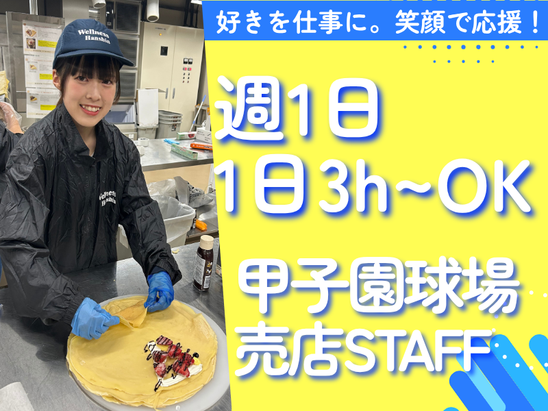 仕事内容 =================== ✅未経験歓迎!髪色自由◎ ✅イベントたくさん!風通しと仲のよさが自慢 ✅暑さ対策もバッチリ!夏も元気に働けます \\\\\ここは注目!///// ✅シフトが超自由!週1~/1日3h~OK Wワークされている方も歓迎! 自分が入れる日数でOK!短期もOK! 急な休みなども相談してもらえれば調整します。 =================== 【 主なお仕事 :笑顔で接客いただくこと】 大きなくくりでは、簡単な調理と接客をお任せします! オーダーの受付・レジ〜生地の焼き上げ クレープの仕上げ〜商品の受け渡し ”甲子園”というお祭り会場に来ているので お客様も明るく楽しく働けます! ①<サークル感覚で働いて一生の思い出つくろう!> スタッフのみなさんが圧倒的に仲が良く、 楽しく働けることが大きな魅力♪ 売店の各スタッフ〜売り子さんまで500名以上の スタッフが在籍。 一生ものの交友関係が築けます♪ ②<ただ稼ぐだけ/楽しいだけじゃもったいない!> 楽しんでるお客様達ばかりなので、 自然とコミュニケーション力や言葉遣い、 人を不快にさせないなどの対人スキルが身につきます! コミュニケーションスキルは一生物の財産。 楽しく働きながら、 今後一生につながるスキルも身に着きます! 先輩や社員のみんなももちろん、常連さんも 優しくフォローしてくれるので、徐々に慣れて いって楽しく働いてくださいね! <スタッフに聞いたウエルネス阪神で働くメリット!> No.1…シフトが入りたい時に入れる No.2…たまにバイトするくらいの感覚で気軽にシフト相談できる! No.3…とにかくスタッフの仲がいい!一生モノの仲間と出会える! <暑さ対策もバッチリ> ・夏用のメッシュポロシャツの制服貸与 ・休憩室は冷房完備+ウォーターサーバーあり └マイボトルの持ち込みもOK ・冷感タオルやクールバンドなどの暑さ対策グッズも着用OK ・熱中症対策のタブレットも完備 <面接はWEBでも対応可能!> ●WEB面接対応中!リモート面接OK!面接のために来社しなくてもWEB上で完結♪