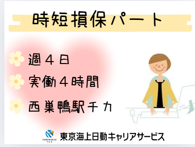 仕事の内容 \TNETのご経験者募集/ ◆少人数×穏やかな雰囲気 ◆週4×9時~13時の実働4hダケ └週3×実働4hのご相談も受付中 @西巣鴨駅チカ 【基本情報】 雇用形態:派遣社員 雇用期間:長期(3カ月以上) 26年1月~開始日相談可能 就業時間:9:00~13:00(休憩なし) 【必須条件】 ◆自動車保険事務のご経験がある方 ◆TNetの操作ができる方 ◆パソコン:基本操作(入力~修正) 【お仕事内容】 ・自賠責、車のリース契約手続き ・法人契約に関する社員サポート(書類作成)など ■種目:賠償責任・火災・自動車 ■保険会社:東京海上日動(98%)、三井住友海上、損保ジャパン <ご家庭と両立しやすい条件> ◆週4×実働4時間ダケ!短時間でムリなく働けます ◆穏やかな雰囲気の職場 【環境面等】 ・@西巣鴨駅/最寄り駅から徒歩3分 ・大手メーカー系列会社の代理店です ・40代・50代の多い職場 ・穏やかで落ち着いた雰囲気 ・オフィスカジュアル内で服装自由 【福利厚生等】 ・扶養内 ・禁煙オフィス!煙苦手な方も安心 ・平日のみOK!土日祝休み ・年間休日120日以上&お休み相談可 └有給休暇 ・ランチタイムは休憩スペース利用OK └お弁当持参OKです ・勤務日数も時間もムリなく調整できるから、家庭やプライベートとの両立も◎少しでも気になった方は、ぜひお気軽にご応募ください♪ ○●嬉しいPOINTたくさん!●○ 履歴書不要!開始日相談OK/長期/駅チカ/駅歩5分以内/ブランクOK/残業なし/時短/短時間勤務/1日4時間以内OK/選べる時間や曜日/時間・曜日応相談/週3日〜OK
