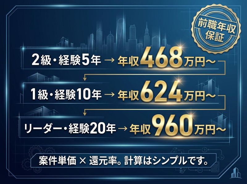 仕事内容 「あなたの月額単価、知っていますか?」 SystemSは全部見せます。そして、業界で最も多くお返しします。 ━━━━━━━━━━━━━━━━━━━━ ◆ 案件単価100%開示 & 業界最高水準の還元率 ━━━━━━━━━━━━━━━━━━━━ 当社は案件の月額単価をすべてオープンにし、 ランク別の還元率テーブルを公開しています。 【SystemS 還元率テーブル】 ▼ メンバー(入社時スタート) 還元率:60~65% ★この時点で業界最高水準 …現場配属の施工管理技士 ▼ ディレクター 還元率:70% …複数現場の統括・後輩指導、案件獲得への貢献 ▼ リーダー 還元率:最大80%(条件あり ※面談時に詳しくご説明します) …事業部の中核。組織運営・採用にも関わるポジション ━━━━━━━━━━━━━━━━━━━━ 【他社との年収比較:月額単価80万円の場合】 大手建設派遣A社(還元率60%)→ 年収 約576万円 中堅B社(還元率70%)→ 年収 約672万円 SystemS メンバー(還元率65%)→ 年収 約624万円 SystemS ディレクター(還元率70%)→ 年収 約672万円 SystemS リーダー(還元率80%)→ 年収 約768万円 同じ現場、同じ仕事。会社が違うだけで年収差は最大192万円。 【月額単価100万円の場合(1級・経験20年クラス)】 大手A社(還元率60%)→ 年収 約720万円 SystemS リーダー(還元率80%)→ 年収 約960万円 差額:年間240万円。5年で1,200万円。 ━━━━━━━━━━━━━━━━━━━━ ◆ 具体的な業務内容 ━━━━━━━━━━━━━━━━━━━━ 民間建築工事(オフィスビル、商業施設、集合住宅等)における 施工管理業務全般をお任せします。 ・施工計画の策定 ・工程管理、品質管理、安全管理、原価管理 ・協力業者の手配、調整 ・発注者との折衝、定例会議への参加 ・施工図のチェック、各種届出書類の作成 ・竣工検査の立ち会い、引渡し対応 ━━━━━━━━━━━━━━━━━━━━ ◆ なぜIT企業が建設事業を始めるのか ━━━━━━━━━━━━━━━━━━━━ 当社は年商5.2億・社員53名のITグループ 「Rise Tech Solutions」のグループ会社です。 ITコンサルティング・DX支援で急成長し、 次の事業の柱として建設事業を立ち上げます。 IT企業だから実現できることがあります。 ・バックオフィスをグループ共有 → 間接コストが小さい → 高還元が可能 ・クラウドツール・AI活用を前提とした業務設計 → 無駄な書類仕事を削減 ・全国に営業所を持たないスリムな体制 → その分をすべて技術者に還元 「テクノロジーの力で、建設業界の働き方を変える」 その最前線に、あなたの経験が必要です。 ━━━━━━━━━━━━━━━━━━━━ ◆ 上場を目指すグループの"創業メンバー"募集 ━━━━━━━━━━━━━━━━━━━━ 当グループは上場を視野に入れた成長フェーズにあります。 建設事業部は今がまさに立ち上げ期。 年功序列も、派閥も、前例もありません。 ランクアップの条件も全部オープンにしています。 ・メンバー → ディレクター:目安6ヶ月~1年 (現場評価+後輩OJT実績+案件貢献) ・ディレクター → リーダー: (複数現場の統括実績+組織運営への関与+新規案件開拓) 最初に来てくれた人に、最も大きなリターンを。 これが経営の約束です。 ━━━━━━━━━━━━━━━━━━━━ ◆ まずは話を聞くだけでもOK ━━━━━━━━━━━━━━━━━━━━ ・オンライン面談OK(Zoom / Google Meet) ・履歴書不要のカジュアル面談からスタートできます ・「還元率テーブルの詳細を聞きたいだけ」でも歓迎です ・現在就業中の方、土日・夜間の面談対応可