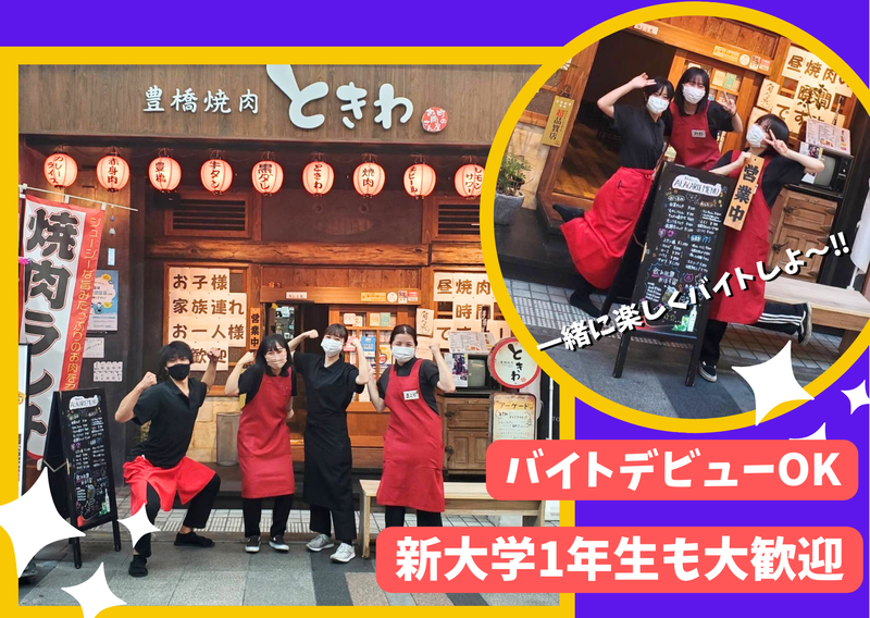 仕事内容 -ここがオススメ- スタッフ割あり 駅チカ 学生活躍中 - <仕事内容> 食材や調理法、空間から接客までこだわった焼肉店。 ホール業務全般をお任せします。 STEP1 まず入社してからお願いすることは、 「ときわ」のことを知ってください! 一緒に働くスタッフと話したり、 メニューを覚えたり。 その後、お客様の帰った席の お片付けをしたりお料理や ドリンク提供を覚えていきましょう。 「できるかな・・・?」と心配しているあなた! 安心してください。 最初にできないのは当たり前! 先輩スタッフや社員が つきっきりでお教えします! 分からないことは、 何回でも聞いちゃってくださいね。 STEP2:おもなお仕事 ・店舗開店準備(簡単な清掃) ・ホールでの接客 ・料理提供 ・配膳 ・ドリンク作成 ・レジ業務 など ・キッチン補助 STEP3:将来的には ・新人アルバイトの研修 ・アルバイトへの指示・管理など 希望者はアルバイトリーダーとして 責任あるお仕事も任せることも可能です。 お店の特徴 ランチもやっているので 昼飲みのお客様から、土日には 家族連れのお客様もみえます。 一直線に伸びる店内には、4名様用を4卓、 6名様用を3卓と計7卓のテーブル席を 備えています。木を基調とした店内は、 清潔感があり落ち着いた雰囲気。 片側はソファー席になっており、 ゆったりと寛いでお過ごしいただけます。 お子様から年配の方まで幅広い世代で 気軽に自慢の豊橋牛をご満喫頂いています。 先輩から一言 お客様に「美味しかった」と 言っていただいた時や、再来店時に 「いつもありがとうございます」と お声を掛けて喜んでもらえた時は、 とてもやりがいを感じます。 チームワークを大切にしながらも、 スタッフをしっかりと指導し、 大切な家族のように 接していきたいと思っています。 事業内容 飲食店 雇用形態 アルバイト・パート