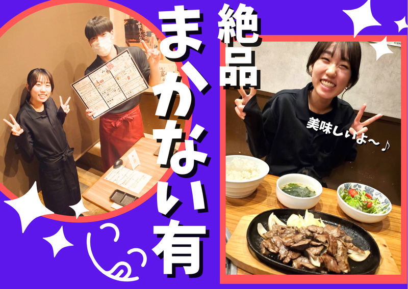 待遇・福利厚生 【福利厚生】 ・まかないあり ・髪型・髪色自由 ・制服貸与 ・即日勤務OK ・友達同士の応募OK *当店のまかない まかないはお店のメニューが スタッフ割で食べられます。 めっちゃおいしいです。 弊社はまだまだ新しい会社なので、若いスタッフが中心で多く在籍しています。 シフトに対応して、スタッフの 誕生日月にはバースデー休暇を設けたり、 お休みも充実!!