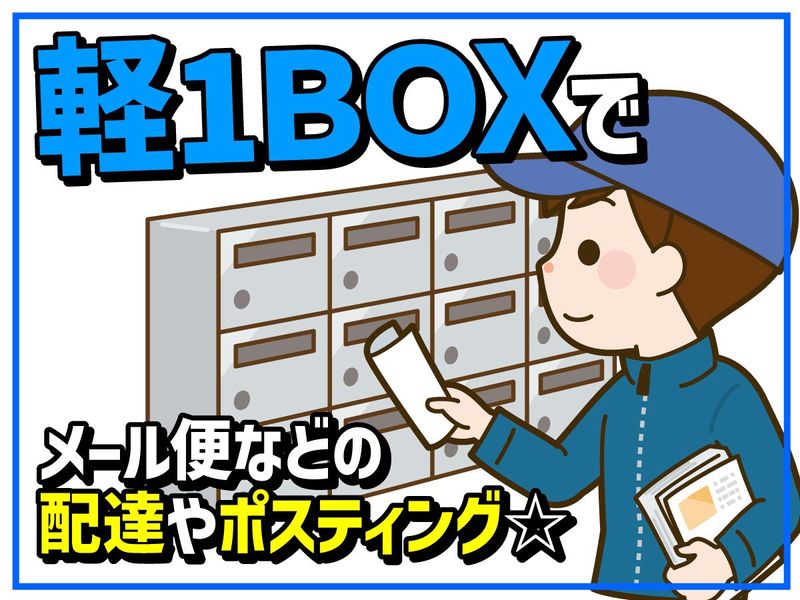 仕事内容 ★普通免許のみでOKの配達業務! ★年齢問わず活躍できます! ★未経験からのチャレンジも歓迎! 【仕事内容】 軽1BOXに乗り、メール便などの配達や ポスティング業務をしていただきます。 ほかに、仕分けなどの軽作業もしてもらいます。 難しい業務ではないので配達未経験の方でもスグ覚えられます。 もちろん最初は先輩が横について 1から丁寧にお教えいたしますので安心してくださいね♪