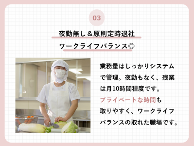 仕事内容 「調理は好きだが、働き方を見直したい」 と考えている20代・30代の方! ◎接客やクレーム対応なし。 →純粋に「料理」と向き合えます。 ◎生活リズムが整う: 深夜勤務なし。 →早番なら15:00で終了。 ◎将来も安心: 育休取得率100%。 【働くメリット】 ✅レストラン・居酒屋経験が活かせます!  ̄ ̄ ̄ ̄ ̄ ̄ ̄ ̄ ̄ ̄ ̄ ̄ ̄ ̄ ̄ ・衛生管理や手順はマニュアル化◎ ・包丁さばきや等の調理スキルは 即戦力として高く評価! ・「売上」ノルマ無し! →丁寧な食事作りに集中できる環境です。 ・最短2年目で店長昇格もあり得ます! ✅働きやすさ抜群  ̄ ̄ ̄ ̄ ̄ ̄ ̄ ̄ ̄ ・残業は月平均10時間以内 →1日残業30分程度!基本定時退社 ・月2回の希望休あり! →土日の休みや連休の取得も相談可能。 ・有給休暇もしっかり消化できます◎ ・ホール業務や接客、 理不尽なクレーム対応なし◎ ・売上ノルマなし◎ →調理に集中可能! ✅安定収入+賞与で生活の基盤を整える  ̄ ̄ ̄ ̄ ̄ ̄ ̄ ̄ ̄ ̄ ̄ ̄ ̄ ̄ ̄ ・月給目安は18万9200円〜26万円。 ・毎月の収入変動が少ないのが特徴です。 ・賞与(ボーナス)支給あり ・正社員登用制度あり (キャリアアップも目指せます) ✅得られるスキル・やりがい  ̄ ̄ ̄ ̄ ̄ ̄ ̄ ̄ ̄ ̄ ̄ ̄ ̄ ̄ ̄ ・大量調理だからこそ磨ける「段取り力」 └ 注文ごとに作る飲食店とは異なり 70~100食を一気に仕上げる ダイナミックな調理スキルが身につきます。 チームで動くオペレーションや 徹底した衛生・栄養管理の知識など 前職では培えなかったスキルが得られます! ・健康を支えるやりがい └ あなたの作った毎日の食事が 子どもたちの成長や 患者様の回復の源になります。 ただ空腹を満たすだけでなく 地域社会の「命と健康」を支える 誇りを持てる仕事です。 【仕事内容】 施設入居者様や患者様 子どもたちの健康のための 食事作りを行っていただきます! <具体的なお仕事> ■ 盛り付け ■ 食事調理 ✨マニュアル有りなので未経験も安心◎ ■ 食器や調理器具の洗浄など - 【転職者の声】 元イタリアンレストラン勤務 (26歳・入社1年目) 「前職は拘束時間が長く、 23時、24帰りが当たり前。 将来結婚や子育てを考えた時に 『このままでは続けられない』 と思い転職しました。 ここに来て驚いたのは、 本当に夕方に帰れること。 仕事終わりに友人と会ったり 家でゆっくり映画を見る時間ができました。 何よりも調理経験を『ありがとう』と 言われる福祉の分野で 活かせることが嬉しいですね」 【職場環境】 会社全体でも… 前職で居酒屋、回転寿司、 カフェ、ホテル厨房などで 働かれていた方が多数活躍中! 約8割が中途入社でスタートしています。