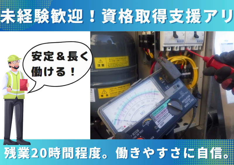 月給316,500円~451,200円 給与詳細 ※基本給・固定残業代の総額 基本給:月給 23万8500円 〜 34万円 固定残業代:あり 1ヶ月あたり7万8000円 〜 11万1200円(固定残業時間:1ヶ月あたり45時間) 固定残業時間を超えた勤務時間については別途残業代を支給する 【一律手当】 全員に一律で支払われる通勤・皆勤・家族手当金額:なし 全員に一律で支払われるその他手当金額:なし 経験・スキルに応じて変動します。 ※固定残業代として45時間分支給しますが、月平均残業時間は20時間程度です。 【給与例】 給与例 400万円(35歳、勤続5年) 440万円(45歳、勤続10年) 570万円(56歳、勤続14年、課長職) 【キャリアアップも目指せる環境】 点検・メンテナンスを経験した後 希望に応じて工事や営業へのキャリアアップも可能です!