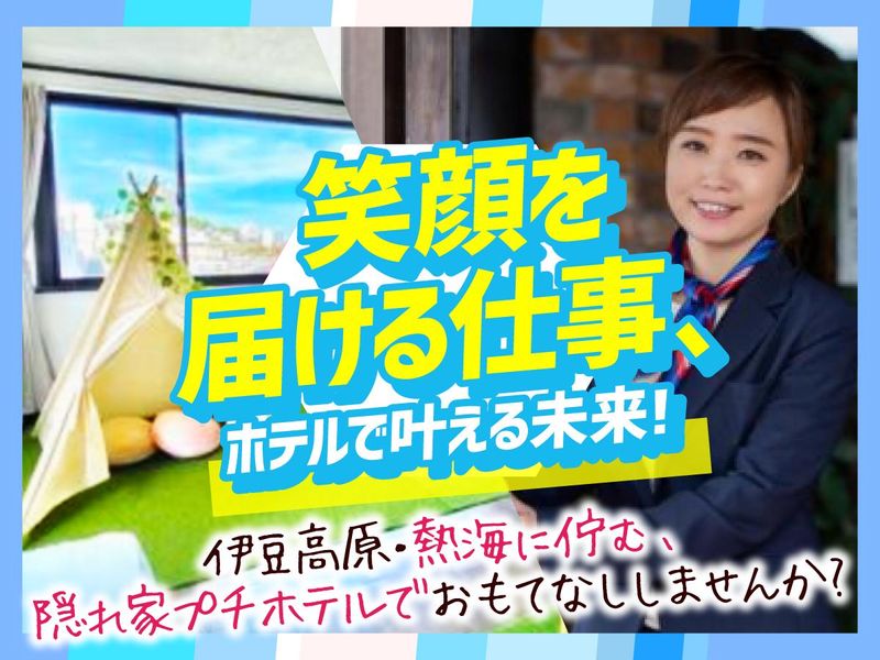 仕事内容 ――――――<ポイント>――――――― ★今年冬オープニング募集★ ★未経験歓迎!必要スキル無し◎ ★経験者給与相談可◎ ★20代・30代・40代・50代活躍中 ★語学力必要なし! ★制服なし!服装自由 ★アイデア積極採用=風の通しの良い職場◎ ★スキルアップも目指せます ――――――――――――――――――― 今年冬OPEN予定!!! 熱海の絶景ホテルで \ アナタらしく働きませんか? / ▶▶新規オープンの 絶景ホテルでの管理スタッフ <具体的なお仕事内容> ・チェックイン・チェックアウト対応 ・宿泊予約業務(入力・電話応対) ・清掃 ・レストラン業務 ・SNS運用 等 - ☆今回オープンするのは、今年冬ごろオープン予定の「熱海」新規ホテル。 勤務地は、熱海・伊豆の3拠点で、オーシャンビュー等の絶景景色が広がっています! お客様はビジネスや観光利用のファミリー・カップル層です! ▼ ▼ お客様対応はチャットツールがあるので、 語学力の心配なし!必要なスキル一切無しです! 未経験の方も大歓迎! ”最初から1人”なんてことは絶対にありません! 先輩スタッフが優しくサポートするので、まずは簡単なできることから徐々に覚えていければOKです。 風通し抜群◎アイデア積極採用! これからオープンするホテルを盛り上げるようなワクワクする素敵なアイデア募集中! どしどし出してください! - <ホテル紹介> 【☆熱海西山町ホテル(仮)】 2026年1~2月にオープン予定のオールインクルーシブホテル。 サウナ、カラオケ、熱海温泉貸切風呂、ゲームコーナーなどコンテンツ盛りだくさん! 高台にあり、ふと窓の外を眺めれば美しい景色に癒される…そんな素敵な職場です。 サービスは至ってシンプル \ だけど、口コミは 4.5以上。/ 当社では、シンプルではあるけど、丁寧な対応 を日々心掛けています。 実際は約1日程度の短い時間…でも、お客様にとってとびきりの、最高の瞬間になるように、 一緒に素敵な時間を作ってくださる方、是非お待ちしております! アルバイトも募集中! (時給1100~1500円、週2~!) お気軽にご相談ください☆彡