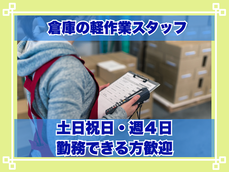 仕事内容 ☆★業務拡大につき増員!大募集!/★☆ ☆★軽作業未経験OK!経験者歓迎!★☆ ☆★土曜・日曜、祝日も勤務できる方!★☆ (週4日以上の勤務) <アルバイト・パート> 物流倉庫スタッフ募集! ▼▼▼ お仕事内容 ▼▼▼▼ 物流センターでの 物流倉庫スタッフとして インターネット通販で取り扱う 化粧品やヘアケア商品に関する 軽作業を担当していただきます。 具体的には以下の業務を行います: ・商品の梱包作業 ・ピッキング作業 ・荷受け・検品・棚入れ作業 コツコツモクモク作業が 好きな方や、得意な方は大歓迎! フォークリフト免許を お持ちの方は優遇します! 分からないことがあれば、 すぐに先輩スタッフがサポートします! ▲▲▲▲▲▲▲▲▲▲▲▲▲▲▲ ⭐\職場の魅力ポイント/⭐ ✅未経験歓迎! ⇒もちろん事務経験者も大歓迎! スキルアップできる環境です! ✅稼ぎたい方は週5日勤務! ⇒勤務曜日も相談可能です! ✅仲間との交流! ⇒スタッフ同士の仲が良く、 楽しい職場イベント (BBQやハロウィンなど)も 盛りだくさんです! ✅取り扱い商品! ⇒巷で人気の美容化粧品や ヘアケア商品を多数扱っており、 商品の流行に敏感な方にピッタリ!