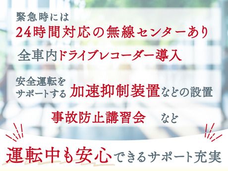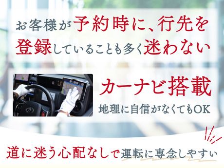 仕事内容 詳しい仕事内容 公共交通機関としてお客様を安心、安全に目的地まで送る仕事です。一人前のプロドライバーとして活躍できる一方で…一般的なタクシー業務を知っていただいた後、学んだことを活かしてドライバーを支える内勤スタッフになることも可能です! ▼3年以上勤務で内勤業務に就くことも可能 ・乗務員の運転をサポートする「運行管理者」 ・お客様の生の声を受け取る「コールセンタースタッフ」 ・仲間を採用していく「採用担当」 など 大手企業の日本交通だからこそ、様々なポジションが設けられ、キャリアアップしていくことが可能です! ※内勤職への異動は確約されたものではなく、ご本人の適性・勤務実績および社内の配置状況を考慮した上での決定となります。 ▼タクシー乗務員の仕事 テレビCMでも話題のタクシーアプリ『GO』経由でのご予約が多いので、お客様をイチから探す必要もなく無理なく安定収入が可能です。道がわからなくてもナビがあるので、地理に詳しくない方でも大丈夫! お客様に愛され続けている大手企業で働ける タクシー業界売上No.1(※)の日本交通グループなので、安心して長くご活躍いただけます。それができるのも、多くのお客様に支持いただけているからです! ▼お客様からいただく声の例 ・安全運転で乗り心地がいいから ・いつも丁寧に接客してもらえるから ・安心して運転を任せられる 一日一回は必ず「日本交通だからお願いした」というお話をお客様いただくほど、愛されているのが日本交通です!先輩たちが築いてきたブランド力があるので、未経験入社でもブランドに守られて安心して働くことができます。 ※タクシー業界売上No.1 =16年連続ハイヤー・タクシー部門全国ランキング1位/サービス業総合調査:2010年~2025年 ※No.1タクシーアプリ『GO』 =タクシー配車関連アプリにおける日本国内ダウンロード数(App Store/Google Play合算値) /Sensor Tower調査:2020年10月1日~2025年9月30日 約1カ月の研修後にお仕事スタートで安心 会社負担で『二種免許取得』 ※最短9日 ▽ 座学でカーナビの使い方、接客マナー、地理を学ぶ『自社研修センター研修』 ※最短23日 インバウンド対応を希望される方には語学研修も実施 ▽ ブレーキを踏むタイミングや運転のコツを学べる「路上での先輩同乗研修」 ▽ 一般的なドライバーとして『乗務開始』 経験を積んだ後は、添乗員のように旅行手配も行う観光ドライバーへのステップアップも可能☆ 一人立ちしても、班長さんや先輩がサポート! しっかり休憩&残業なしの働き方 休憩は3~4時間とれるので、体をしっかり休める時間が確保されています。「お客様の通勤時刻やアプリ予約の多い時間帯に乗務し、夜間にゆっくり仮眠」「定期的に休憩」「時間をずらしてランチ」など自由度高く働けます。インバウンド対応を希望する方も、自分のペースで学びながら働けます。ギリギリまで業務を行いしっかり稼ぐのも、定時退社して自分の時間を大切にすることもOK! お得な福利厚生や働きやすさをご紹介 ▼自分も家族も使える福利厚生あり 例)エステやフェイシャルケア66%割引、引っ越し料金最大30%割引など ※詳しくは福利厚生欄をチェック! ▼季節や天候に影響されずに働ける 仕事中の大半を冷暖房が完備された車内で過ごすため、夏は涼しく、冬は暖かい環境で働けます。 ▼長く働ける ドライバー60歳以上のシニアも活躍中。インバウンド対応のスキルを活かして、新たな挑戦ができる環境です。