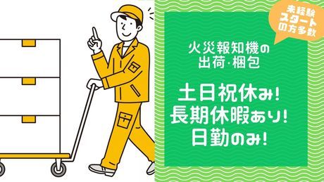 仕事内容 火災報知機の出荷作業・梱包作業をメインにお願いします! 資格や経験ゼロでもOK! 段数積みされた商品の数が数えられる方は 作業がよりスムーズに行えます♪ 出荷作業などの経験がある方も歓迎! <こんな方の応募が多数です> (1)「次のお仕事が決まるまでのつなぎに◎ 即日勤務OK!すぐに働けます」 (2) 「ブランク期間をつくらず収入確保!転職活動と両立できるお仕事」 (3) 「スグ働ける!日払い・週払いOK◎ 転職準備中の収入も安心」 「転職活動中も収入をキープ!スキマ時間で働ける柔軟シフト◎」 「正社員へのステップにも◎ 経験不問&即日スタートで新しい一歩を!」 他にも主婦(夫)・パートさんも活躍しています 【いつでもどこでも登録OK★】 ◆登録時【履歴書不要】【来社不要】 ◆当社HPから、365日/24hいつでもWEB登録可能♪ <Q&A>入社までの流れについて Q. 応募してからどれくらいで働けますか? A. 応募から入社までは、1週間~通常2週間以内の現場が多くなっています。 Q. 急いで仕事を始めたいのですが対応してもらえますか? A. 即日面談やスピード対応が可能な案件もご案内可能! ご希望をお伺いして、最短で就業できるお仕事をご紹介いたします。 Q. 他の仕事と比較してから決めたいのですが、相談だけでも可能ですか? A. もちろん可能です。 複数の選択肢をご提示しながらご案内します! <Q&A>収入について 【お給料の支払いについて】 Q. 日払いは対応していますか? A. はい、日払いに対応しています。 前日の11時までに申請⇒当日の夕方までにお給料をお受け取りいただけます。 Q. 夜勤の場合でも日払いは可能ですか? A. はい、夜勤後も対応可能です。 お仕事終了後、朝11時までに申請⇒その日のうちにお給料をお受け取りいただけます。 Q. 前払い制度はありますか? A. ご利用可能です。 詳細は勤務先や就業形態によって異なりますので、ご相談時にご希望をお伝えください。 Q. 申請方法は難しいですか? A.どなたでもスムーズにご利用いただけます。 スマートフォンやPCからの申請も可能です! 昼食は、お弁当注文(約500円)や持参、最寄りのコンビニも可能です。 自販機やドリンクサーバーも完備されており、休憩スペースも充実しています。