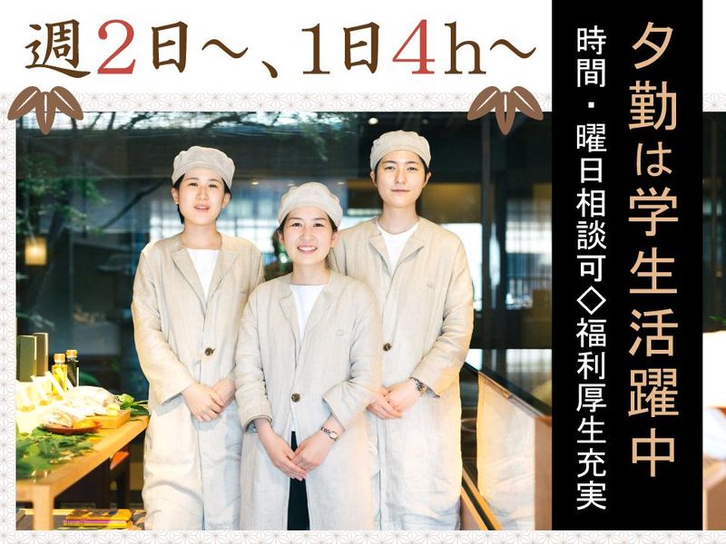 仕事内容 ✨夕勤スタッフ大募集!学生さん歓迎!✨ ✨京都の文化や四季を感じる食品を販売✨ ✨美しい言葉遣いや所作も身に付きます✨ 華やかに働ける百貨店♪接客に興味ある方ぜひ! ==================== ✅看板商品・れんこん菓子「西湖」等、菓子類 のほかちりめん山椒・お鍋・お惣菜・オード ブル等、幅広いラインナップ!お客様と会話 をしながら【おもたせ】を提案・販売します。 ※【おもたせ】とは…? →京都では「贈答品」を指し、 相手を敬って使うことば。 ✅商品のご配送の際には一筆お手紙を添えて みたり…あなたの心遣いが活かせる職場。 ふとした会話で、お客様が本当に求めていら っしゃる商品が見えてきたりしますよ。 ✅実は私たちの大切な商品はTV、雑誌、 WEBなどによる広告宣伝を一切行って おりません。商品を愛してくださる方が 増え、店舗数を増やすことができ、 様々な商品開発につながったのも 「クチコミ」で評判が広まったから。 期待値高く来店される方も多くいらっしゃいます。 お客様によってご要望も異なりますので、 マニュアルに縛られずに真心こめて柔軟に 対応いただける方は大歓迎です。 ===弊社「紫野和久傳」について=== 保育手当や育休制度など 充実した福利厚生が魅力的な弊社。 創業150年の安定企業×百貨店という、 安心できる環境で一緒に働きませんか?