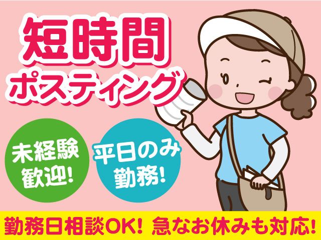 仕事内容 短時間のポスティングスタッフを募集! ////////////////////////////////////////// ◎未経験者歓迎!知識不要! ◎土日祝休みでプライベートも充実! ◎日中の短時間勤務!無理なく働けます! ◎急なお休みにも柔軟対応! ////////////////////////////////////////// 【主な仕事内容】 ━━━V━━━━━━━━━━━━ 一般住宅や集合住宅に 当社のイベント案内やチラシを配布したり、 アンケート調査などのPR活動を行います。 特別な経験や知識は一切不要ですので、 初めてでも安心して働けます! ブランクがある方も大歓迎。 お仕事復帰の第一歩として、 無理なくスタートできる環境を提供しています。 【お仕事の魅力!】 ━━━V━━━━━━━━━━━━ 〇1日実働4時間 家事や育児の合間に無理なく働けます。 短時間勤務なのでプライベートとの両立が可能です! 〇土日祝休み! お子様の学校行事や体調不良による 急なお休みにも柔軟に対応します。 〇曜日や時間帯相談OK 月曜~金曜の平日で勤務日選べます! あなたのライフスタイルに合わせた働き方が可能です。 ******************* 『外に出て仕事がしたい!』 でも…こんなお悩みありませんか? 「久しぶりの仕事復帰で不安…」 「しばらく仕事から離れていた…」 「子どもの行事や急な病気にも対応したい…」 「親の介護もあるので、両立できるか不安…」 そんな心配を抱えている方でも、 安心して働ける環境です。 ご不明な点やご質問等がございましたら まずはお気軽にお問い合わせください。 WEBからの応募は随時受付中です。