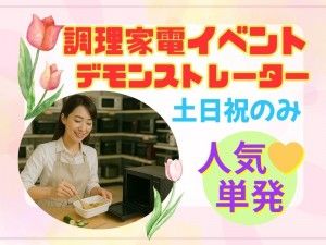 インフォメーション 土日祝など単発のお仕事♪月に2日~でもOK☆ 最新調理家電のPRイベント調理スタッフ募集☆彡 家電量販店で土日だけ開催されるPRイベントのおしごと 炊飯器やオーブンレンジなどを使った デモンストレーションや お客様への紹介説明をお願いします♪ アピールポイント ・。・。ジャストヒューマンネットワークでは 他にもさまざまなお仕事をご紹介しています!・。・。 例えば・・・ ◇短時間勤務でお子様のお迎えに間に合う仕事 ◇平日休み土日祝のみの仕事 ◇1日だけ働きたい!そんな方にピッタリのお仕事 ◇将来的に頑張り次第で正社員になれるお仕事 ◇安定してしっかり稼げるお仕事 ◇空いた時間を有効に♪WワークOKのお仕事 ◇得意なことを活かしたお仕事(語学など) 「事務・受付」「接客・販売」 「営業・ラウンダー」「イベント」などなど・・・ ☆派遣で働くのが初めての方もご安心ください(^^)/ お仕事探しから就業後のフォローまで担当営業が しっかりサポートいたします! まずはお気軽にご相談ください♪ スタッフ一同あなたのやる気を全力で応援します(*^_^*) 【JHN-event】