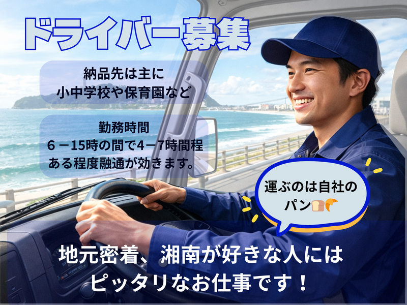 仕事内容 ✅ 40代・50代スタッフ活躍中 ✅ 1日10件程で、15時には業務終了! ✅ 決まった配送先のみで道を覚えやすい ✅ 日中勤務で生活リズムが安定 ✅ 学校休暇に合わせた長期休みあり ✅ 未経験からでも安心して始められる環境 創業100年以上の製パン会社で、 学校・病院・直営店舗などへ自社製品のパンを配送するお仕事です。 接客や営業要素はほとんどなく、コツコツ安全運転ができればOK。 落ち着いて長く働きたい方にぴったりです。 【具体的な仕事内容】 ① 出社・積み込み 配送先ごとに商品を確認し、トラックへ積み込みます。 ② ルート配送 平塚・大磯・藤沢・大船エリア中心。 1日10件程度で、駐車場完備の施設がほとんどです。 ③ 回収作業 空箱やパレットを回収して次回配送へ備えます。 ④ 帰社・終了 午後の配送完了後、15時頃に業務終了予定。 早めに終わる日中勤務です。 【入社後は】 最初は先輩が同乗し、配送ルートや積み込み手順を丁寧にお教えします。 覚える内容はシンプルなので、ドライバー未経験の方でも無理なくスタート可能。 あなたのペースで慣れていけます。