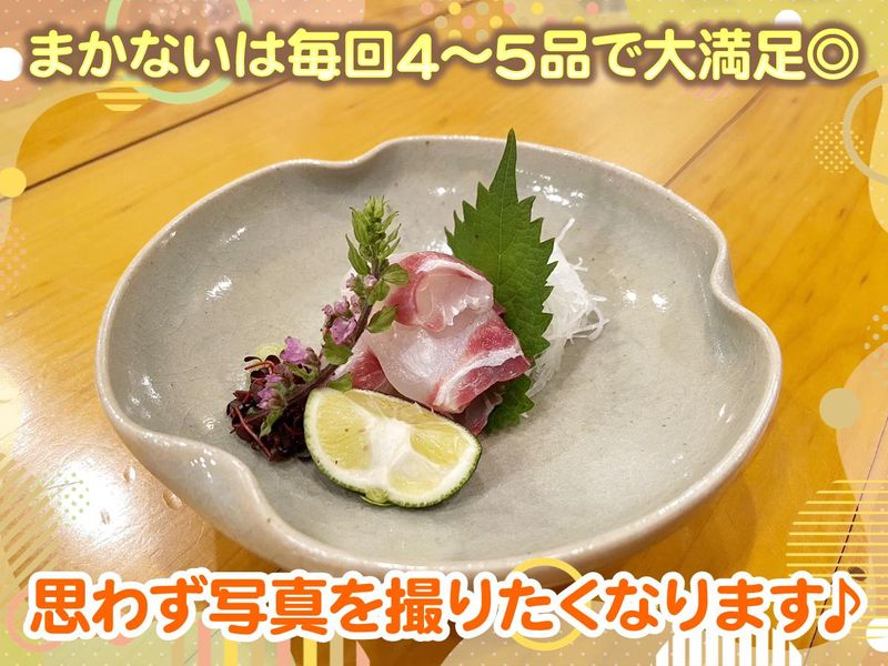 仕事内容 オープンキッチンでお客様もスタッフも よく見えるあたたかいお店です。 お客様の接客・お料理提供・ 盛付けなどをお願いします。 調理は一切ナシ♪ オーダー取りや飲み物の注ぎ方は 先輩が1:1でサポートします。 - ◆旬の魚や野菜・お刺身・お肉など 実際のメニューが賄いとして食べられます!! 毎回4~5品で大満足! 写真を撮って家族に自慢するスタッフもいるほど(笑) - <オーナーさんより一言> バイトさんは学生さん・フリーターさんで 構成されていてみんな若いです。 年齢が近いのもあってか バイト同士の仲は良いみたいで、 バイトがない日に一緒にごはんに行ったり 遊んだりすることもあるみたいですよ! 慣れるまでマンツーマンでお教えします。 頼れる優しい先輩ばかりなので安心してください。