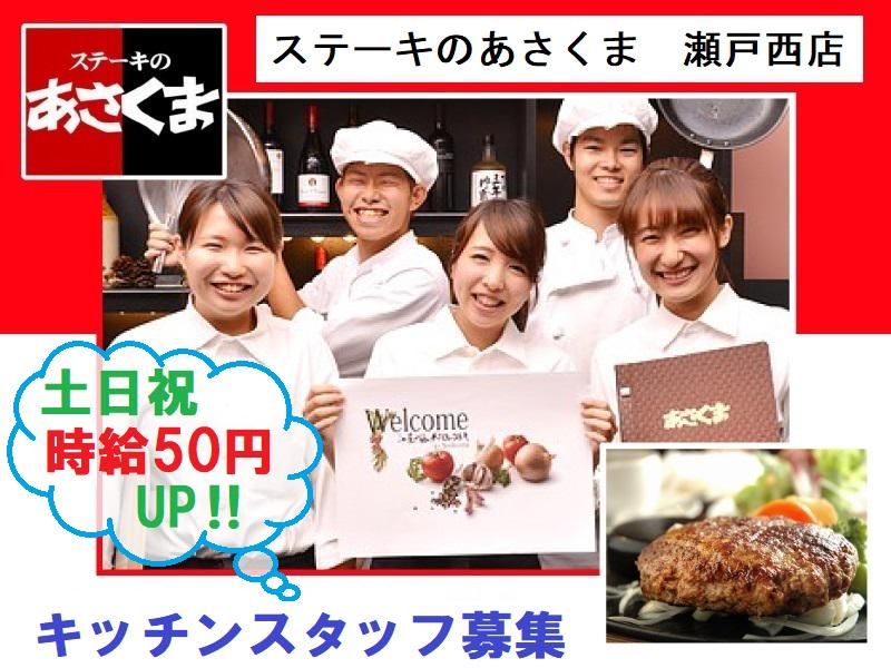 仕事内容 ・。~~~~~~~~~~~~~~~~~ ✨ステーキのあさくま 瀬戸西店✨ ★★★土日祝時給50円UP★★★ 土日祝キッチン特に歓迎!! 長期歓迎! 冬休みだけ・春までの短期もOK! 大学生のアルバイトデビュー応援! パート復帰も歓迎! ~~~~~~~~~~~~~~~~~・。 盛付・調理補助や惣菜作り、 ビュッフェの補充、洗い場などを お願いします。基本、裏方業務です。 *キッチン専任OK! *ホールと両方やってみたいも相談OK! 飲食店・レストランキッチン勤務経験者、 大歓迎! もちろん未経験も歓迎です!