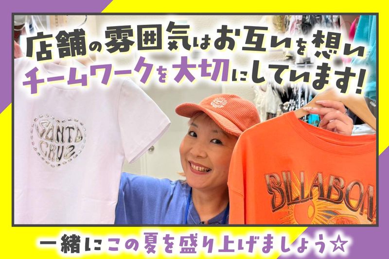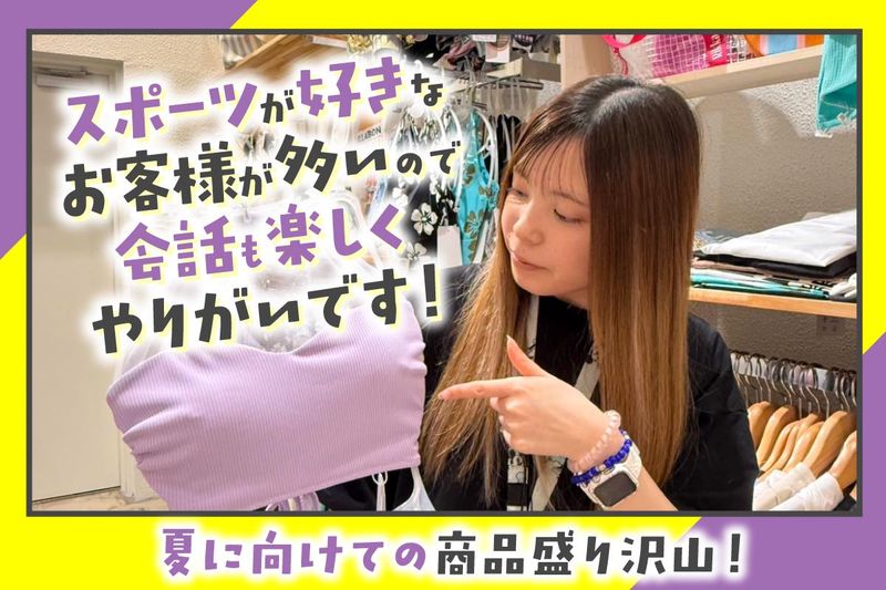 仕事内容 。Λ__Λ (*0ω0) ・―U―U―――――――――――――――・ >> 自分らしいオシャレで働ける << >> 楽しく続けられる販売のお仕事 << ✅髪色・ネイル・ピアス自由 ✅服装自由(トップスのみ支給) ✅社割あり(商品が半額で購入可能) 好きなファッションを楽しみながら、 あなたらしく働ける環境です。 ・―――――――――――――――――――・ \ 夏に向けてスタッフ積極採用中! / \ ご応募いただいた方は全員面接します / 人気のアパレル販売で、 新しい一歩を踏み出しませんか? ✅未経験の方も大歓迎 ✅週3日〜勤務OK ✅副業・Wワークも可能 ✅土日メイン・夕方のみもOK ✅面接時は履歴書不要 ✅駅チカ&自転車通勤OK ◇──── お仕事内容 ────◇ レディース水着を中心とした 接客・販売業務をお任せします。 女性のお客様対応がメインです。 ・商品のご案内やコーデ提案 ・レジ対応、簡単なPC入力 ・品出し、在庫チェック ・売り場づくりや店内整理 未経験でも安心スタート◎ 先輩スタッフが丁寧にサポートします。 ##職場の雰囲気・うれしい特典## 社員割引で気になる商品も お得に購入できるのが魅力です♪ 20代~30代のスタッフが中心で、 明るく居心地の良い雰囲気。 初めての方もすぐ馴染めます。 ##キャリアアップも応援## アルバイトから社員登用の実績あり。 ・販売を長く続けたい方 ・アパレル業界に挑戦したい方 ・安定した働き方を目指す方 そんな気持ちをしっかりサポート。 日々の経験を積みながら、 着実に成長できる環境です。