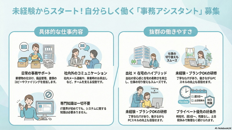 アピールポイント: ━━━━━━━━━━━━━━━━━━━━━━ ◎ ライフスタイルに合わせて働くメンバーが活躍中 ◎ ━━━━━━━━━━━━━━━━━━━━━━ 時短・週3日~ 自分のペースなら、無理なく長く続けられる ブランクOK! 働きながらPCスキルアップもできる ━━━━━━━━━━━━━━━━ ◎ ハイブリッド勤務で無理なく働く ◎ ━━━━━━━━━━━━━━━━ ◆ 「出社の安心感」と「在宅の柔軟さ」 ◆ 駅チカでお買い物や息抜きも◎ ◆ オンオフを切り替えやすい働き方 ◆ 子育て・介護・通院など急な予定にも柔軟対応
