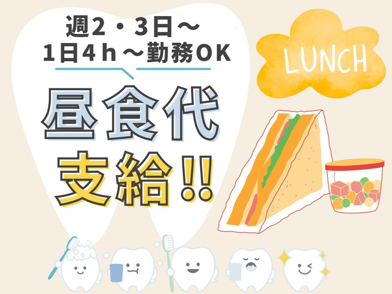 仕事内容 / 無資格・未経験でもOK! 自分のペースで働ける 週2日、週3日~OK! \ *・。・*・。・*・。・* 【 仕 事 内 容 】 *・。・*・。・*・。・* 〇診療補助 〇器具の準備 〇片付け・洗浄 〇患者様の呼入 などをお任せします。 \\ここがポイント// 1)働き方が選べる!!  ̄ ̄ ̄ ̄ ̄ ̄ ̄ ̄ ̄ ̄ ̄ 週2・3日~、1日4h~勤務OK *ご家庭やお子さんの都合に合わせて 無理なく働けます! 2)無資格・未経験からのチャレンジ大歓迎  ̄ ̄ ̄ ̄ ̄ ̄ ̄ ̄ ̄ ̄ ̄ ̄ ̄ ̄ ̄ ̄ ̄ ̄ ̄ ̄ 医療のお仕事に興味がある方の チャレンジも大歓迎! *フォロー体制バッチリなので 安心してスタート出来ますよ。 3)昼食代の支給有り!  ̄ ̄ ̄ ̄ ̄ ̄ ̄ ̄ ̄ ̄ ̄ ̄ 嬉しい昼食代の支給有り! 美味しいご飯でお仕事も頑張れます** 4)駅チカで通勤もラクラク  ̄ ̄ ̄ ̄ ̄ ̄ ̄ ̄ ̄ ̄ ̄ ̄ ̄ ̄ 最寄り駅から徒歩5分! アクセス良好の立地です。 車通勤もOK*