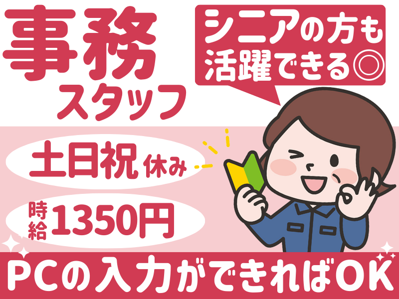 仕事内容 \未経験◎選べる勤務時間&土日祝休み/ ✨PC入力ができればOK!未経験歓迎 ✨10:00〜19:00/17:00or18:00退勤も可 ✨土日祝休み&年末年始休暇あり ✨作業服支給&マイカー通勤OK ✨ お仕事前の面談はご自宅付近で! 気軽にご相談ください! ✨正社員登用あり&WワークOK ✨ なんと有休消化率90%以上! 自由に使えます♪ …………………………… ■ 仕事内容 …………………………… 事務作業をお任せします! ◎具体的には… ●専用システムへのデータ入力 ●出荷伝票の仕分け ●作業内容の入力や報告など PC入力ができればOK! 特別なスキルは不要◎ …………………………… ■ 未経験大歓迎! …………………………… むずかしい作業はありません◎ 仕事を丁寧に教えてもらえる体制が 整ってるので安心して働いて頂けます! …………………………… ■ グループ会社があり、 経営は安定してます! …………………………… 株式会社 いづみのグループに所属しております。 経営基盤も安定しております。 下記のリンク先から会社HPを確認できます! https://www.idumi-g.co.jp/