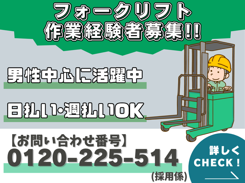 求めている人材 【必須資格】 ✅要フォークリフト免許 ―――――――――――――――――― ○経験者歓迎 ○ブランクOK ○フリーター歓迎 ○男性多数活躍中 ○幅広い年代の方活躍中! (20代・30代・40代) ―――――――――――――――――― \ こんな方におすすめ! / ◆物流倉庫や貨物ターミナル、 工事現場、廃棄物処理場、 製造工場などでの作業経験がある方 ◆コツコツ作業や モクモク作業が得意な方