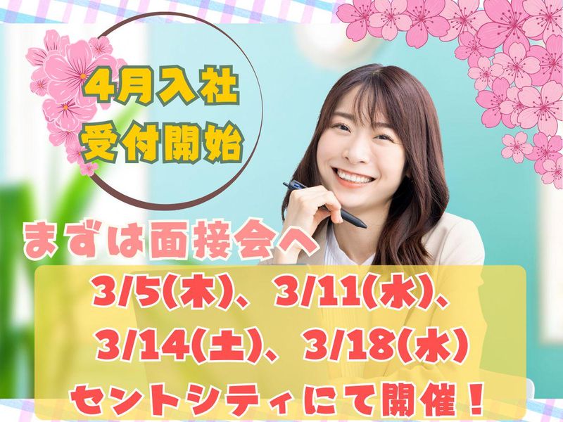 選考プロセス ●WEBから応募頂くか、お気軽にお電話下さい。 ●面接会※要事前予約※以下の時間内でおひとりの所要時間は30分程度です。 <面接+タイピングテスト> 【日時】3/5(木)、11(水)、14(土)、18(水)の10時~17時 ※日程が難しい場合は別途相談OK 【会場】セントシティ9階 【持ち物】履歴書(写貼) ※応募数の状況によっては事前に履歴書郵送をお願いし書類選考を行なうケースがございます。 また、以前にご応募いただき不採用だった方については選考基準が変わらない場合、選考をお断りすることがございます。