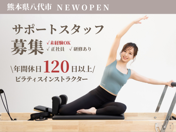 仕事内容 \八代にマシンピラティスNEW OPEN/ 未経験から始めるサポートスタッフ募集! ✼┈┈┈┈┈┈┈ Point ┈┈┈┈┈┈┈✼ ✅年間休日120日、正社員募集 ✅髪色自由!ネイルOK★ ✅未経験・資格未所持の方も大歓迎!前職・経歴不問 ✅研修あり ✅人と話すことが好き・体を動かすことが好きな方歓迎 ✅動画を活用したレッスンで未経験でも安心 ✼┈┈┈┈┈┈┈┈┈┈┈┈┈┈┈┈┈✼ ◎3月6日更新 「仕事をしながら、自分の体も整う」 そんな新しい働き方を始めませんか? マシンピラティスは、姿勢・体幹・呼吸を整えることで ・肩こり改善 ・猫背改善 ・スタイルアップ などを目指せる人気のフィットネスです。 「未経験OK/研修あり」だからスタートも安心。 オープン前から関われるので、 お店づくり・雰囲気づくりまで関われるのも魅力です! ✅新しいことに挑戦したい ✅人と関わるのが好き ✅美容・健康に興味がある ✅働きながらキレイになりたい そんな方にぴったりのお仕事です。 体を動かす仕事がはじめての方も大歓迎◎ 【入社後スケジュール】 3月 オープン準備のお手伝い(備品購入などをお願いします!) 4月 研修開始 5月 プレオープン ☞【お仕事内容】  ̄ ̄ ̄ ̄ ̄ ̄ ̄ ̄ ̄ ̄ ̄ ̄ ̄ ̄ ̄ ̄ お客様が安心してレッスンを受けられるようサポートをおねがいします! 実演は基本的になく、 動画をもとにお客様の状態を確認しながら サポートやワンポイントアドバイスを行います。 <主な業務内容> ◆マシンピラティスのレッスンサポート ◆マシンの使い方のご案内 ◆体験・見学の対応 ◆受付などの簡単なお客様対応 ◆店舗の清掃 ◆店舗運営のサポート業務 ◆SNSなどを使った情報発信 運動経験がない方も、 外部研修をご用意しているため安心してスタートできます! 「ちょっと興味がある」「やってみたい」 その気持ちをきっかけに前向きに仕事に取り組める方を歓迎します。 ぜひお気軽にご応募ください! ✼••┈┈┈┈┈┈┈┈┈┈┈┈┈┈┈••✼ 【運営会社 トヨオカ地建について】 不動産業界で長年の実績を持つ、地域密着の企業です。 新規事業として、2026年5月に ピラティス専門スタジオ【Éclame(エクラム)】をオープンします。 ※掲載写真はイメージです ※本求人はハローワークにも掲載しています ✼••┈┈┈┈┈┈┈┈┈┈┈┈┈┈┈••✼