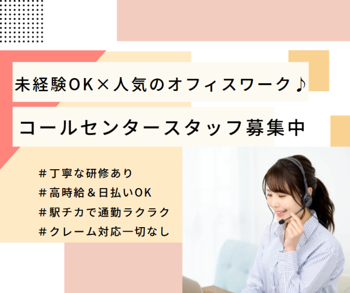 PR・職場情報 \人気のコールセンター×受付対応/ **発信なし&システム入力のみ** 【お勧めPOINT】 ★20~40代が活躍中の職場♪ ★週4日~OK ★未経験大歓迎 ・難しい対応はないので安心 ・わからないことはすぐに聞ける環境 ★駅チカで好立地 ・西中島南方駅徒歩3分/南方駅徒歩5分/新大阪駅徒歩10分 ・自転車通勤もOK! 【待遇制度】 *週払いOK♪ *履歴書不要のスマート採用♪ *WEB面接随時開催! 【応募方法について】 「応募する」ボタンをご利用ください。 こちらより折り返しご連絡いたします。 電話でのご応募もお待ちしております。 ※電話受付/9:00~18:00 ◆面接場所について ・大阪市淀川区の勤務地周辺 ・当社オフィス(大阪府大阪市中央区) 上記よりご希望に合わせて対応いたしますので リラックスしてお越しくださいね♪ ※面接時に履歴書はなくてもOK! ◆「AsBee」について 2020年設立以来、成長を続けている注目の企業! 物流業界の大手「富士ロジテックグループ」の一員として、 豊富な案件と安定した仕事量を誇ります♪ 求人ポイント 交通費支給,即日勤務OK,急募,駅から5分以内,週4日からOK,副業・WワークOK,主婦・主夫歓迎,長期,新卒,フリーター歓迎,大量募集,学歴不問,残業月20時間以内,転勤なし,未経験者歓迎,経験者歓迎,ネイルOK,週払いOK,有資格者歓迎,研修あり,社会保険完備,50代以上応募可,ブランクOK,家庭都合休OK,禁煙・分煙,シフト制,ピアスOK,服装自由,40代以上応募可,第二新卒歓迎,履歴書不要,友達と応募OK,髪型・髪色自由,週5からOK,固定時間制