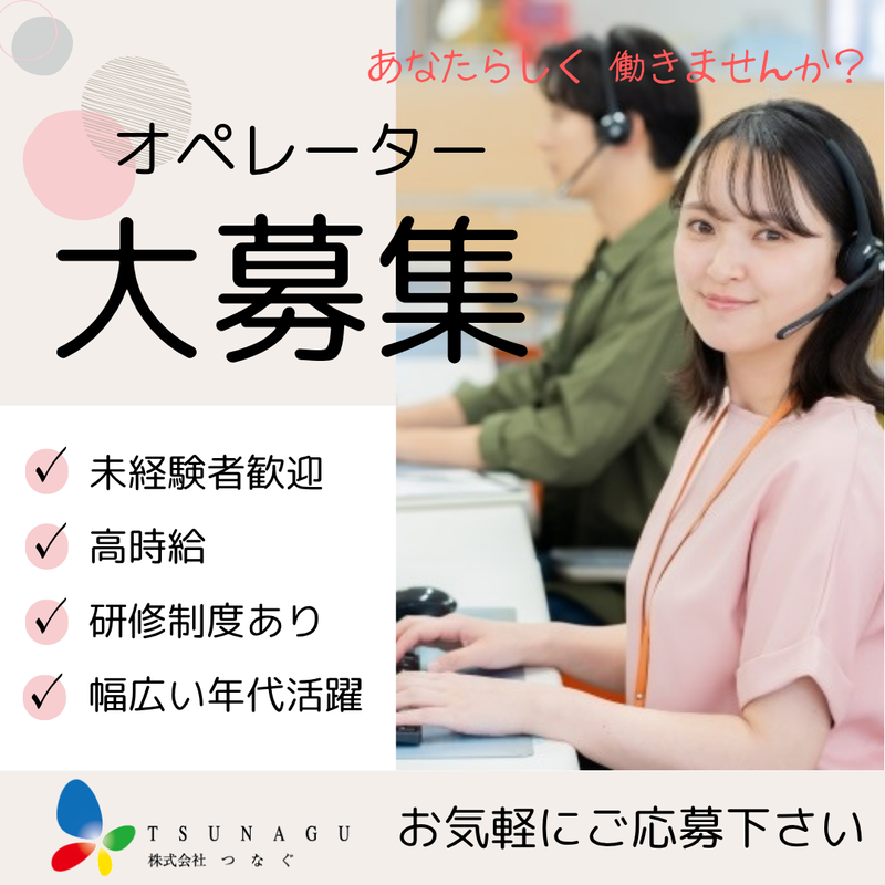 求めている人材 ✅応募者みなさんと面接します! ✅未経験者さん大歓迎! ✅学歴・経験・年齢一切不問! ・履歴書不要です! ・お仕事ブランクがある方も歓迎! ・社会人経験がない方もOK! ✅主婦(夫)さん大歓迎! ・扶養内で働きたい方 ・育児や家事と両立したい方 ・子育てがひと段落した方 ✅経験・スキルは不要です! ・PCは簡単な入力ができればOK! ・Wワーク・副業OK! ・フリーターさん、学生さんも歓迎! ✅一つでも当てはまればピッタリ! ・家庭や育児と両立したい ・久しぶりのお仕事復帰がしたい ・扶養内でお小遣いを稼ぎたい ・マニュアル通りに話す方が楽 ・人と話すことが好き ・オープニングで働きたい ・駅チカで通いやすい職場が良い