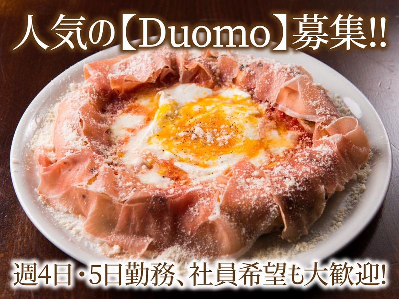 仕事内容 ・:・*・:・*・:・*・:・*・:・*・:・*・:・*・:・*・:・*・:・*・:・ ★週4日・5日勤務してガッツリ稼ぎたい方! ★調理の勉強をしたいと考えている方! ★ゆくゆくは正社員で働きたいと思っている方! まずはお気軽にお問合せください♪ ・:・*・:・*・:・*・:・*・:・*・:・*・:・*・:・*・:・*・:・*・:・ イタリア製の薪窯&オープンキッチンのある 本格イタリア料理店『ドゥオモ』 接客が好き!料理の勉強をしたい!という方大歓迎です。 【お仕事内容】 オープン前にセッティングや下準備を行い、 お店が開店した後は、 お客様の接客やご案内、 キッチンでの調理をしていただきます。 飲食店の経験がない方も 丁寧にお教えします。 これから覚えていきたい、 チャレンジしたい方を応援! 一緒に頑張って働ける方を募集しています。 話だけ聞いてみたい! という方もお気軽にお問合せください。