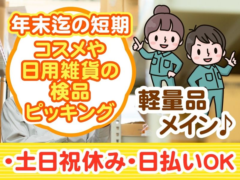 仕事内容 【年末までの短期募集】 物流会社で化粧品や日用雑貨などの検品・ピッキング作業 その他、梱包・ラベル貼り・製品加工などを担当していただきます。 【おすすめポイント】 ・短期でしっかり稼げる ・取り扱い商品は軽いものがメイン ・女性スタッフ多数在籍 ・日勤のみ ・9:00~17:00 ・土日祝休み ・検品未経験者も大歓迎 ・日払いOK、週払いOK ・面接は来社不要、電話やWEBで行えます ・履歴書不要 日払い制度で入職直後の金銭面もフォロー! 面談後は職場見学を実施いたします。 【職場環境】 2階の加工作業場にも空調あり。 快適環境で行う検品作業です。 ・休憩室有 ・給湯室有 ・分煙室有 ・敷地内駐車場有 ・自販機有 【コーディネーターのおすすめポイント】 コスメや日用雑貨など、様々な商品を扱う物流センターでのピッキング作業。 軽いものが多いので物流未経験の方も安心。現在活躍している当社スタッフは女性の方が多く、不明な点はいつでも先輩スタッフに聞ける環境です。主婦パートをお探しの方にもおすすめ。 【ご登録に関して】 ・WEBでのエントリー ・お電話でのエントリー どちらもご対応可能です。 ご応募後は受付担当からご連絡差し上げます。 ※来社不要のWeb面談も実施中です! 【GWJが"ぴったりのお仕事"探しを応援】 GoodWorkJapan/グッドワークジャパンは「人に合う仕事探し」を大切に、 ・日払い対応 ・Web面接 で スムーズな就業・転職をサポートします。 面談後は職場見学で実際の雰囲気を確認できるので安心です。 まずは登録から!あなたのご希望をお聞かせください! ここまでご覧いただきありがとうございます。 興味を持っていただけた方はお気軽にご連絡ください。