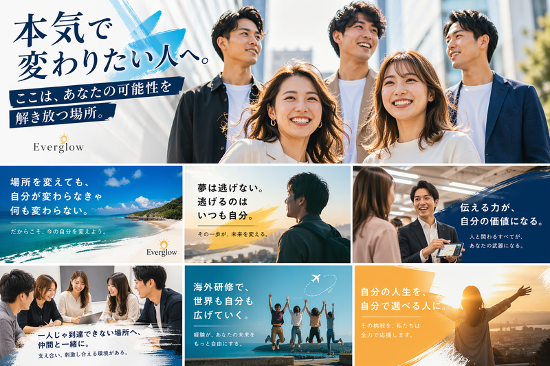 アピールポイント: 【この仕事で身につくもの】 ・営業力 ・提案力 ・コミュニケーション力 ・新しい環境で結果を出す力 ・現場で考えて行動する力 ・将来につながる実践経験 Everglowが大切にしていること 私たちは、ただ働く場所を提供したいわけではありません。 このままでは終わりたくない 環境を変えてでも挑戦したい 自分の人生を自分の力で切り開きたい そんな想いを持った人が、 新しい環境の中で成長し、可能性を広げていける場所をつくっています。 最初から完璧である必要はありません。 必要なのは、変わりたい気持ちと、自分を試してみたい意志です。