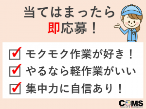 インフォメーション 【座り作業もOK】人気の軽作業・モクモク作業!交替制 無理なく稼ぎたいという方にぴったり! 未経験者歓迎の工場作業です。 衛生面にも気を遣ったきれいな職場、 空調ありで快適な作業環境です。 立ち作業と座り作業が選べます! 座り作業希望の方は椅子を貸与! また、希望者は休憩時間を分割し複数にわけて とることが出来ます。喫煙者などにも人気★ アピールポイント コムズR&Dは、 熊谷市、行田市、加須市、太田市近隣の お仕事情報や、人材派遣登録を 行っております。 私達は 「地域の方々が地元企業で働き続けること」 を提供しております。