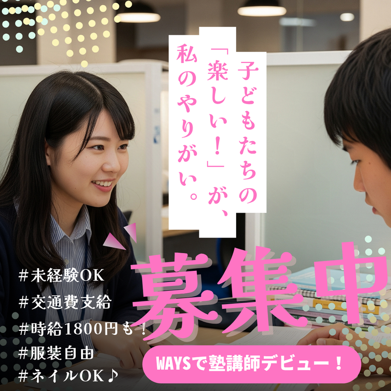 仕事内容 \1コマ2,700円/ ネイル、染髪、私服可! ・個別指導WAYSとは、中高一貫校生を対象に、数学・英語のテスト対策指導を行う塾です。 好きや得意を仕事にできます! 主に数学、英語を指導していただきます。 ・WAYSでアルバイトするポイント ★時間外労働、指導後の残業一切なし! 授業前の予習など時間外の労働や、講義後の報告作業による残業は一切ありません。 ★コミュニケーションが取りやすい! 私たちWAYSは、社員の平均年齢が20代と若いことが特徴です。 年齢の近い先輩講師が沢山いるので、不安なことがあれば教室長や先輩方に何でもご相談ください。 〈仕事内容〉 WAYSの塾講師として子どもたちの学習指導をお任せします! 子どもたちの「塾に来るのが楽しい!」という言葉がやりがいです!