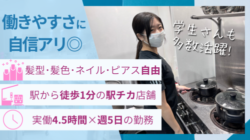 【保険制度】 雇用保険、労災保険、健康保険、厚生年金 待遇・福利厚生 【福利厚生】 ★交通費規定支給 ★車通勤可能 ★賄いあり ★社員登用制度あり ★制服貸与 ★髪色・髪型自由 ★ピアス・ネイルOK ★扶養内勤務可能 ★副業・WワークOK