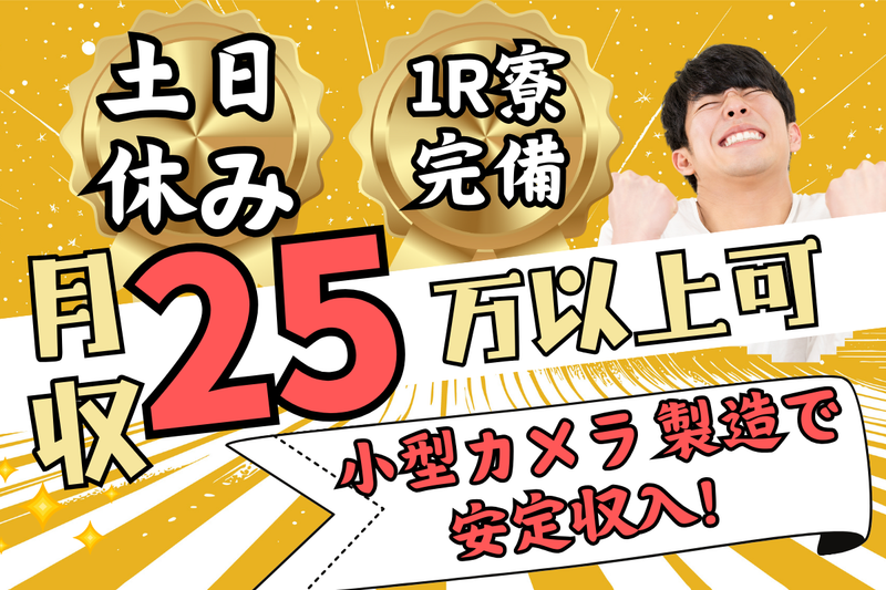 仕事内容 【 応募から2週間程度で内定可能! 】 《 ここがポイント! 》 ●高月収25万円以上可能 ●嬉しい土日休み ●費用減額の寮あり ●空調完備で働きやすい ●構内には食堂や売店も! 《 外より過ごしやすい快適工場! 》 自動車のバックモニター用の カメラを作る工場で製造ラインを担当。 ■マシン操作 マシンのボタンを押したり、 エラーが出て機械が停止した際の対応。 重大なエラー対応ではなく、 機械が止まった時に 簡単に解除できる対応のため 専門知識が無くてもOK! ■目視検査: 完成したパーツに汚れ、歪み、 傷がないかチェックします。 一定のタイムでこなす作業のため、 慣れてくると余裕をもって お仕事する事ができます。 - 《 外より過ごしやすい快適工場! 》 カメラ部品を扱うので、 職場は非常に清潔でホコリなどもなし! さらに温度・湿度が一定に保たれているため 猛暑の日でも、ジメジメの梅雨でも 寒い日でも職場がずっと快適♪ - 《 お得でおいしい!食堂完備! 》 ランチは385円~で利用可能! 広い食堂を利用可能♪ さらに売店もあり、 歌詞パンなども売っています。 休憩室、喫煙所も完備されているので 休憩中はリラックスして過ごせます。 - 《 黙々・コツコツ働ける! 》 工場内のお仕事は基本的に一人作業が多め♪ 一人で集中してお仕事をしたい方におすすめ! - 《 寮や自宅問わず通勤交通費支給 》 那須町や那須塩原市から 通っている方も多い工場です♪ 別方面だと矢吹町方面からの通勤者も! 鏡石町、天栄方面からも通勤可能★ ※通勤交通費に関する規定あり - 《 幅広い世代のスタッフが活躍 》 先輩もほとんどは未経験スタート◎ お仕事に慣れるまでは 丁寧に指導しますので安心してください! ほとんどの作業は機械にお任せなので あっという間に慣れてしまいます☆ - 《 先輩から一言! 》 ◆スタッフMさん(男性:25歳)4ヶ月前入社 住み込みの仕事を探していて、 社宅費用が安くすむので こちらの職場に決めました。 大手企業なので福利厚生もしっかりしていますし、 何より社宅費用の補助があるので 好きな事に使えるお金があるのがいいですね。