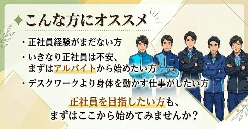 求めている人材 \20~30代が活躍中!✨/ ◆未経験OK ◆学歴不問 ◆運転免許不要! 資格・スキルは一切問いません!やる気・意欲を重視します★ \ こんな方、ぜひご応募を!/ ◎これまで正社員としての勤務経験はない ◎運送業に関心はあるけれど、まずはアルバイトから始めたい ◎デスクワークより身体を動かす仕事がしたい ◎社内ジョブチェンジなど選択肢が多くある会社で働きたい