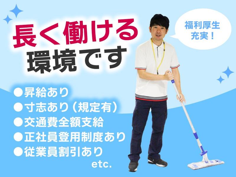 求めている人材 ◆高卒以上 ◆長期勤務できる方歓迎 ◆未経験者歓迎 ◆コミュニケーションを大切にできる方 ◆清掃業務の経験をお持ちの方優遇 (リーダーポジションを経験された方も優遇) ◆マネジメント経験がある方歓迎