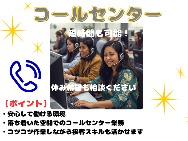 仕事内容 ╭━━━━━━━━━━━━╮ 派遣だから叶う理想の働き方♪ ╰━v━━━━━━━━━━╯ 業務範囲が明確で残業も少なめだから、 プライベートとの両立もバッチリ! 転職を繰り返すリスクなしで、 様々な企業での経験が積めるのは派遣ならでは♪ 正社員では難しい柔軟な働き方が、 派遣だからこそ叶えられます✦ ✧✦今月採用強化中✧✦ 派遣デビューにもおすすめのお仕事♪ 「プライベートも充実させたい!」 「色んな仕事をしてみたい!」という方へ まずは一度お話してみませんか? ⋆ ˚。⋆୨୧˚おすすめポイント˚୨୧⋆。˚ ⋆ ◇未経験OK!先輩のサポートありで安心 ◇お客様対応中心で、難しい作業なし ◇短時間勤務・フルタイム勤務相談OK ◇1人1人区切られたスペースで集中できる ◇誕生日にはミニプレゼントをお渡しします♪ 【仕事内容】 斎場内でのコールセンター業務をお任せします♪ 【仕事の流れ】 ▼お客様からのお問い合わせ対応 ▼決められたフォーマットへのPC入力 ▼書類整理や簡単なデータ管理 ◇受電のみで負担なし♪ ◇PCの基本操作ができればOK! ◇1人1人区切られたスペースで集中して作業可能 ◇先輩が丁寧にサポートするので安心♪ 【アピールポイント】 \金欠の味方◎手当&支払い制度が充実!/ ■週払いOK&前渡し制度ありでお財布安心♪ ■有給休暇ありで休みも取りやすい! ■交通費支給&マイカー通勤OKで通勤ラクラク◎ ■社会保険完備で長期勤務も安心! ✧\派遣デビューも安心のサポート/✧ 困ったことや不安なことは、 担当スタッフがしっかりサポート! 働きやすさを第一に考えた制度が整っています ✧ \家庭と両立◎短時間勤務や制度充実♪/ 家事や育児の合間に働きやすい環境です。 短時間勤務からフルタイムまで相談可能◎ 週払い・前渡し制度などの待遇も充実で 無理なく安心して長く続けられます◎ 【研修教育】 入社後はOJT研修で 先輩社員がしっかりサポートします! 独り立ち後も疑問点や不安なことはいつでも 相談して一緒に解決していきましょう♪ ▼派遣先 福島県郡山市開成 ▼派遣元(株式会社BRec) 福島県郡山市桑野2丁目39-21