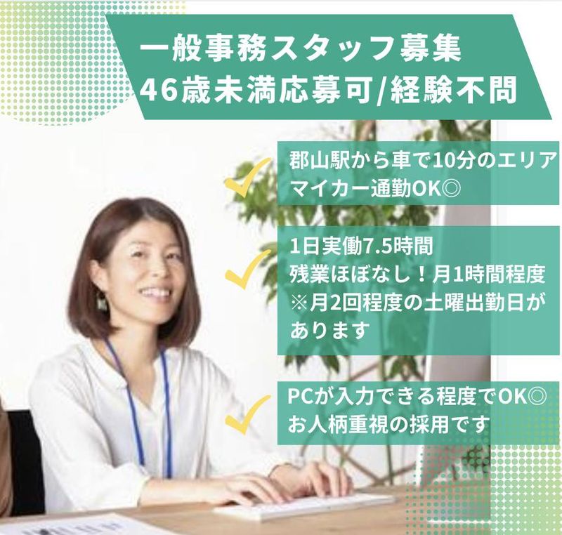 仕事内容 ■経験不問/自動車ガラス専門店での事務のお仕事です。 ・郡山駅から車で10分程度のエリア/マイカー通勤OK ・46歳未満応募可/要高校卒業以上 ・電話応対をメインでお任せします ・実働時間7時間30分 ・月残業ほぼなし!月1時間程度が平均です 自動車ガラス専門店として、30年以上歴史のある当社。 社内の事務作業全般をお任せするスタッフを募集いたします◎  ̄ ̄ ̄ ̄ ̄ ̄ ̄ ̄ ̄ ̄ ̄ ̄ ̄ ̄ ̄ ̄ ̄ ̄ ■お仕事内容について オフィス内での一般事務業務全般をお任せいたします。 電話や来客対応など、お客様との会話もお任せします。 【具体的な仕事内容】 ・電話、来客対応 ・見積り書などのパソコンでの入力業務 ・自動車ガラスの在庫管理 ・外出用務(集金や一部配達のお手伝いなど) ・その他付随する業務 繁忙期の手が回らない場面では、 月1〜2回程度お客様への納品をお手伝いいただく場面もあります。 もちろん普段は専業のスタッフがおりますのでご安心を。 普段と同じように、 お客様・社内共にコミュニケーションが取れる方であれば、 きっとご活躍いただけると思います。  ̄ ̄ ̄ ̄ ̄ ̄ ̄ ̄ ̄ ̄ ̄ ̄ ̄ ̄ ̄ ̄ ̄ ̄ 【ご入社後は】 OJTでの研修を想定しています。 先輩社員について、できることをひとつずつ増やしていきましょう。 いきなり1人で、帳票を全てお任せするようなことはありませんので、 ご安心ください。