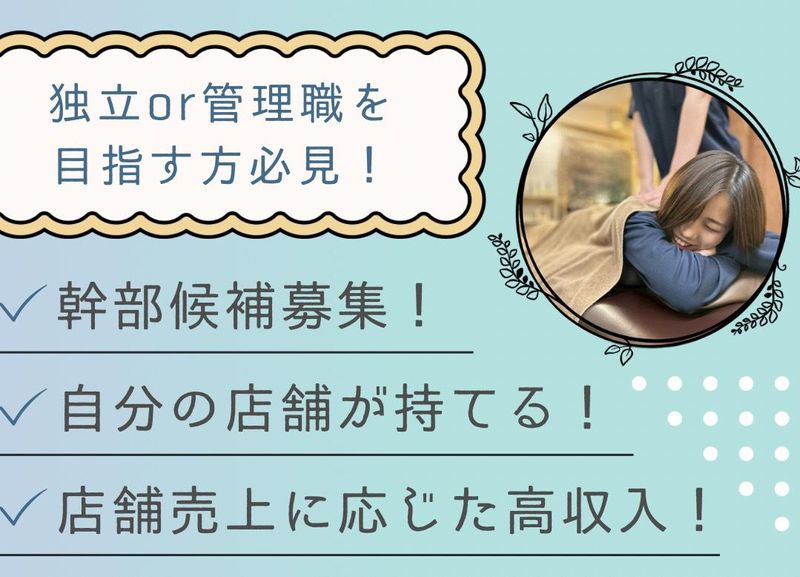 仕事内容 \\ この求人のPOINT // ◎20代・30代活躍中 ◎男性社員の採用実績多数 ◎雇用形態問わず希望休を取りやすい環境! ◎有休使用も遠慮なく言ってくださいね♪ 【仕事内容】 あなたの手一つでお客様のカラダをもみほぐし、お客様のお疲れを癒すお仕事です。 ▼施術メニュー▼ ・もみほぐし ・足つぼマッサージ ・ハンドリフレ ・ドライヘッドスパ ・ストレッチ整体 お疲れの部位などを伺いながら、お客様に合った施術内容を提案してください。 ◎業務委託でも勤務もOK! ご希望があれば面接時にお伝えください♪ ◎業界経験者だからこそわかるRakuaの働きやすさ 【インターバル時間の確保徹底】 セラピストさん一人一人が万全な体調で施術に臨んでいただけるよう、売上重視でガンガン詰め込むような予約の取り方はしません! もちろんこのインターバルとは別に休憩時間をとっていただくのもOKです♪ 【営業ノルマ一切なし】 Rakuaでは回数券や物販の販売は行っておらず、次回予約を強制するような営業トークを強いることもありません。 余計なプレッシャーを感じることなく、のびのびと勤務していただける環境を整えております。 Rakuaグループは現在、埼玉県内に10店舗展開中!未経験スタートのスタッフも多数在籍しています! 前職は美容師、営業職、さらには動物園の飼育員という異色の経歴の持ち主も☆☆ 現役セラピストさんには心機一転、働きやすい新たなサロンとして最高の環境をご提供! まずはサロンを見学してみたい、話だけでも聞いてみたいと言うお問合せも大歓迎です。 【あなたの実力次第で夢が広がる】 当サロンでは、施術スタッフとして経験を積み、実績を出せば 自分の店舗を持つチャンスがあります。 自分で物件を探し、経営陣にプレゼンして承認されれば、あなたの店舗がオープン! 屋号は「もみほぐしRakua」ですが 直営店として、あなたが店舗管理者となり 安定と自由を両立できます。 さらに、勤務地の柔軟性も抜群! 「子育てや介護で 今の店舗に通うのが難しい…」 そんな時も辞める必要はありません。 実際に、自宅近くの物件を提案し、 新店舗をオープンしたスタッフもいます! ▼▼ 先輩スタッフからの一言 ▼▼ 『Rakua』で活躍しているスタッフは、美容・健康・ファッションといった関連業界はもちろんのこと、一般事務・データ入力・営業アシスタントといった事務職や、保育士・看護師・柔道整復師などの有資格者、カフェ店員や居酒屋アルバイトなどの飲食業界、中には元動画クリエイターなど、様々な業界・職種で活躍してきた方が未経験からプロになっていますよ!
