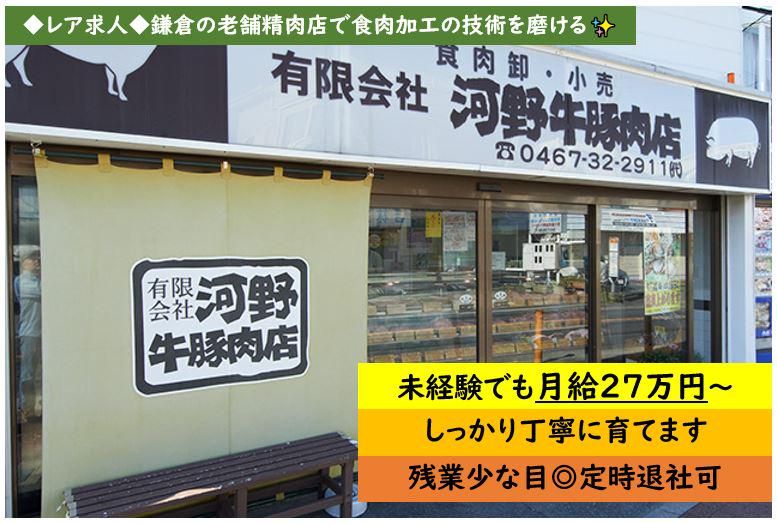 仕事内容 ┏─・─・─・─・─┓ 106年続く老舗店 ┗─・─・─・─・─┛ ⏩アピールポイント ────────── ✅完全週休2日制✨ ✅未経験でも月27万~ ✅お肉の社割あり⭐ ✅有給消化率高め! ────────── 【お仕事内容】⏰ 鎌倉で愛される老舗の 『河野牛豚肉店』にて お肉の加工と販売を お任せします!✨ ✅お肉の加工 ✅店頭での販売 ※接客のメインは アルバイトさんです。 ※タイムスケジュール例としては・・・ 8時→出社 8時~13時→加工業務と並行し、接客業務 13時~14時→ランチタイム 14時~17時→加工業務と並行し、接客業務 18時→閉店 18時30分→退勤 オーダーに合わせて お肉を切り出したり、 お料理のアドバイスを お願いします!⭐ 神戸牛や近江牛、 鹿児島黒牛などの 銘柄牛をはじめ、 希少な高級肉を 多数扱っています。⭐ 「河野のお肉は違う!」 と県外から通って くださるファンも多く 美味しいに関わる 悦びを感じられます!✨ ⌒⌒⌒⌒⌒⌒ ⭐未経験からプロへ ⌒⌒⌒⌒⌒⌒ ほとんどの社員が 業界・職種未経験の スタートです!✨ 経験豊富なスタッフが 丁寧に指導するので、 安心して飛び込んで きてください。୨୧ 最高級のお肉を扱う 専門知識も培えます。 「ありがとう」の言葉や ご相談に応えられた時の やりがいは格別です!✨ ⏰働きやすさ抜群! ✅ノルマも一切なし! ✅未経験で月給27万~ 経験を積めばさらに お給料もアップします◎ ⏩お休みについて⭐ 半休取得もOK!✨ 平均有給取得日数は 10日(2025年実績)! 事前に調整すれば、 長期連休の取得も 可能です。୨୧ リフレッシュを大切に プライベートと両立 できる環境ですよ。✨ ⏩私たちについて⭐ 創業106年の老舗です。 希少な銘柄肉等高級な品を多く扱います♪ 百貨店からもお声がけいただき、 近年は催事にも出店。 上野松坂屋、横浜高島屋、名古屋高島屋、そごう横浜、都筑阪急 などに出店しています。 幅広い商品ラインナップと、 お得意様の多さで安定成長中です。 先輩社員も最初は未経験スタートが大半。 丁寧に指導しますので、 着実に知識を付け、活躍していただけるかと思います。 勤続年数が長い社員も多く、 穏やかな職場なのが特徴です。 長く安定的に働いていきたい方を募集します。