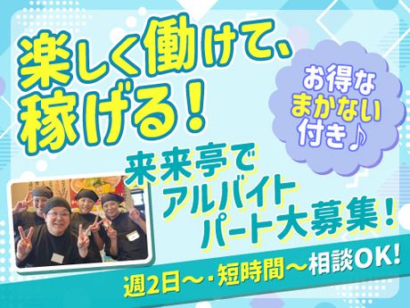 資格 ★未経験者大歓迎!飲食店経験は一切不要 ★経験者の方ももちろん歓迎! ★主婦(主夫)歓迎 ★WワークOK! ★学歴不問 ★扶養内勤務OK ★中高年の方も活躍中! ★ブランクのある方も歓迎 ★アルバイトから正社員を目指したい方も大歓迎 【来来亭の三大原則】 「大きな声での挨拶」 「ニコニコ笑顔で対応」 「キビキビとした行動」 この3つを大切にし、お客様に「また来たい!」と思ってもらえるお店作りを目指しています。 「大きな声や笑顔、キビキビした動きに自信がない…」という方も安心してください。 最初は誰でもできません!先輩がしっかりサポートしますので、安心してスタートできます。 【スタッフの前職例】 コンビニ、カフェ、居酒屋、レストラン、工場、軽作業など、さまざまな前職を持ったスタッフが活躍中! 「家が近い」「ラーメンが好き」「高収入だから」など、動機は何でもOK! 【特別なスキルは一切不要】 ラーメン屋での経験や知識は全く必要ありません。 「稼ぎたい」「飲食店で働いてみたい」など、まずはやってみたいという気持ちがあれば大歓迎!