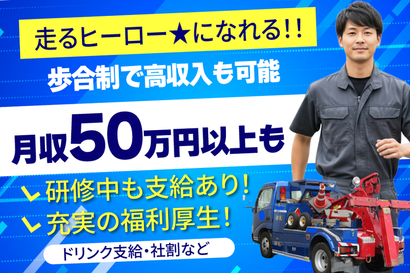 仕事内容 \\“ありがとう”が直接もらえる仕事!// 走るヒーロー★レッカードライバー募集! 【アピールポイント】  ̄ ̄ ̄ ̄ ̄ ̄ ̄ ̄ ̄ ̄ ★未経験・無資格スタートOK (中型免許も入社後の取得応相談) ★歩合制で月収50万円以上も可能 (売上の25%還元) ★ドリンク支給(正社員限定) 【仕事内容】  ̄ ̄ ̄ ̄ ̄ ̄ 車のトラブルに駆けつけ、 お客様をサポートする仕事です。 ロードサービスを中心に、 JAF案件も多数。 <主な業務内容> ・故障車・事故車の現場対応・運搬 ・レッカー車・積載車での搬送 ・パンク時のタイヤ交換、バッテリー交換 ・現場での応急対応や電話対応 ・車両の簡単な点検・整備補助 ★現場では「ありがとう」「助かった!」 の言葉を直接もらえる、やりがい抜群の仕事です。 【当社について】  ̄ ̄ ̄ ̄ ̄ ̄ ̄ ̄ 株式会社グランドステージは、 京都を拠点にロードサービス・ 車両搬送事業を展開。 技術力とスピード対応で 信頼を積み重ねてきました。 お客様に安心を届ける “頼られる存在”として成長を続けています。 【採用サイトはこちら】  ̄ ̄ ̄ ̄ ̄ ̄ ̄ ̄ ̄ ̄ ̄ ▼採用サイト https://site9.saiyo-dekirukun.com/grand-stage 当社の雰囲気まるわかり! Instagram・TikTokも公開中! ▼Instagram https://www.instagram.com/p/Cf3npJRvuwH/ ▼TikTok https://www.tiktok.com/@grandstagekyoto 【未経験でも安心!】  ̄ ̄ ̄ ̄ ̄ ̄ ̄ ̄ ̄ ̄ ・先輩スタッフがマンツーマンで丁寧に指導 ・研修期間中も正社員として雇用 ・中型免許がなくても応募OK →入社後の取得も相談乗ります。 ・異業種からの転職者も多数 (例:ミキサー車・飲食・建設業など) 【最後に…】  ̄ ̄ ̄ ̄ ̄ ̄ トラブル現場に駆けつけるのは、 お客様の“困った”に最前線で応えること。 その分、やりがいも、成長も、 報酬も大きい仕事です。 未経験でも「助けたい」 という気持ちがあれば大丈夫。 一緒に“走るヒーロー”になりましょう!