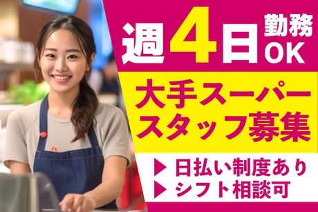 仕事内容 【お仕事詳細】 \ 午後から安定♪大手スーパー / セミセルフレジスタッフ募集★ お昼までは自由に使える13時スタート! お客様対応がメイン&作業はシンプル。 「レジが初めてで不安…」という方も安心です◎ 【お仕事内容】 ・お客様を笑顔でお迎え ・商品を受け取りバーコードをスキャン ・会計済みのカゴへ商品を移す ・会計金額をお伝えし、会計レジ番号をご案内 →お金のやり取りは自動釣銭機! 計算・受け渡しなしで安心◎ =================== 【安心のポイント】 ★操作ミスが心配な方も◎ お釣り計算は機械におまかせ! 「金額を数えるのが不安…」でも大丈夫♪ ★未経験でも始めやすい 研修で一つずつ覚えられます◎ ★接客が楽しい 「ありがとう」を直接もらえるお仕事です♪ =================== 【PRポイント】 *未経験OK×高時給1400円! 月収24万円以上も可能♪ *20代~50代まで幅広く活躍中◎ *日払い・週払い(規定)OK *地元で愛される大手スーパーで安心勤務♪ 常連さんも多くアットホームな雰囲気です◎ \ “ピッ”とスキャン中心で安心スタート♪ / 未経験の方も大歓迎! 少しでも気になったらお気軽にご応募ください** *契約について* ●採用後の転勤の有無(就業場所の変更範囲):無 ●採用後の業務内容の変更範囲:無 ※雇用契約更新の可能性:有(更新条件:契約期間満了時の業務量、労働者の勤務成績・能力・態度、会社の経営状況、従事している業務の進捗状況により判断する)