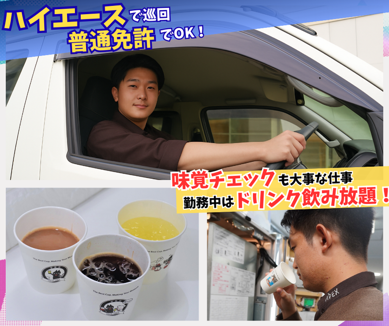 仕事内容 ✼┈┈┈┈┈弊社の注目Point┈┈┈┈┈┈✼ ✅【安定】全国トップクラスの運営規模! ✅【手当】業界屈指の手厚い住宅手当! ✅【収入】賞与年2回+決算賞与で年3回支給 ✼┈┈┈┈┈┈┈┈┈┈┈┈┈┈┈┈┈┈✼ 【弊社について】 株式会社アペックスは、 コーヒーや紙コップ式飲料自販機の リーディングカンパニーとして 全国で事業を展開しています! ①業界トップクラスの安定基盤 全国規模の事業展開と確かな売上が、 あなたの生活を支えます! ②お客様に自信を持って提供できる商品力 有資格者(自販機調整技能士、コーヒーインストラクター) ※資格者の割合が高いため 高いサービスレベルの維持が可能になっております! ③常に進化する専門技術 自社でマシンを開発しているため、 最先端の知識や技術を身につけられ 市場価値の高い人材に成長できます! 【具体的な仕事内容】 設置の自動販売機を、 ハイエースなどで巡回します。 ◆ルート配送場所(例) ✅オフィス(社員食堂、休憩室) ✅病院の待合室 ✅学校 ✅駅 ✅空港 ✅高速道路のSAなど さらに ✅ 街の暮らしを支える「公的施設」 ✅ 笑顔や感動が生まれる「エンタメ施設の舞台裏」 など、 え、こんなところにも入るの? という驚きが、毎日のちょっとした楽しみに!! ◆主な作業内容 ✅紙コップ式自販機のゴミ回収、 ✅釣り銭回収、補充、 ✅紙コップ/ドリンク原料(コーヒー豆等)の補充 ✅機械の清掃 ✅機械メンテナンス を行います。 平均作業時間:15~20分/台 ルート配送件数:10~20台/日 毎日決められたルートではなく、 近距離の担当エリア内で自販機の稼働率などを 予測し優先順位を変えたり、交通状況を 加味して自分なりに進めていただけます。 入社後、まずは1〜2ヶ月間先輩に同行して 業務を覚えていただきますが、弊社は 面倒見の良い20代、30代の社員が多く 在籍していますので、研修以外でも気軽に 相談しやすい環境です。人間関係はとても良いです! ✼┈┈┈┈┈┈┈┈┈┈┈┈┈┈┈┈┈┈✼ 【この仕事の大変なところ】 ・自販機の知識インプット 紙コップ自販機は、缶の自動販売機とは異なります。 自社自販機以外に、コカコーラやサントリー(一部)の 紙コップ自販機も作業範囲のため、 座学的な知識のインプットが必要です。 ・突発的な故障対応による残業対応 設定した自販機の故障などの問い合わせも 1日に0 ~ 1件ほど入ります。 夕方頃の営業所に戻るタイミングで急に問い合わせが入り、 現場に向かうケースがあります。 ✅独り立ちの不安を解消する万全のサポート体制 「覚えることが多くて無理かも」 「一人で回るのが精神的に不安」 といった入社後のギャップを解消するため、 当社はサポート体制に力を入れています。 【入社後の研修スケジュール】 入社後は、2ヶ月かけてじっくりと業務を習得できる研修をご用意しています。 先輩社員がマンツーマンで丁寧に教えるので、未経験の方も安心してスタートできます。 1ヶ月目 座学研修:会社の事業内容や社内ルールを学びます。 OJT研修:先輩に同行して、日々の業務の流れや自販機の操作方法などを覚えます。 2ヶ月目 実務研修:独り立ちに向け、簡単な業務から少しずつ実践。 先輩のサポートを受けながら、業務をスムーズに進めるスキルを身につけます。 3ヶ月目以降 担当エリアを受け持ち、独り立ち。 定期面談やオンライン研修などで、継続的にあなたの成長をサポートします。 困ったことがあれば、いつでも気軽に相談できる雰囲気です。 私たちは、拠点全体で新入社員をサポートする体制を整えています。安心して飛び込んできてください! ✼┈┈┈┈┈┈┈┈┈┈┈┈┈┈┈┈┈┈✼ ✅「ずっと同じ場所」から ✅「自分だけの空間」へ! 現在のお仕事で、「指示待ち」より 「自分なりの段取り」を重視したいとお考えですか? もしそうであれば 弊社のお仕事は、 良い意味で「あなた1人の時間」です。 自分のペースで今日の担当エリアを回れるので、 誰かに急かされることも、 ずっと立ちっぱなしのストレスもありません。 ✅ITスキル不要!機械オンチも歓迎。 現場で光るのは「磨き上げる手際の良さ」です。 パソコン操作や運転スキルより、 何よりも大切なのは、 自販機をピカピカに仕上げる「丁寧さ」と、 それをテキパキこなす「スピード感」です。 本格的な修理は専門メカニックに任せてOK。 ✅入社後にお願いしたいのは、 これまで培った「段取りの良さ」を活かした メンテナンス能力や真面目に向け合える姿勢です。 コツコツ着実に、かつテキパキと現場を回す。 そんな機敏な動きが最大の武器になる職場です! ✅※原則 転勤はありません。