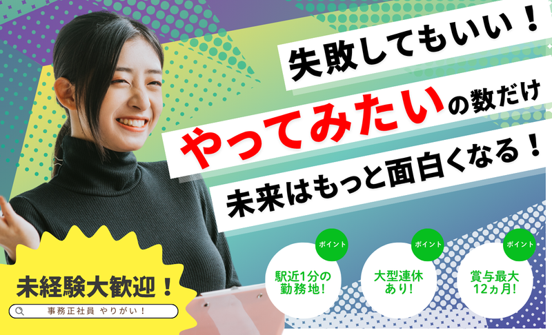 求めている人材 \こんな方を求めています!/ ・コツコツと業務を進められる方 ・前向きなコミュニケーションでチームワークを大切にできる方 ・PCスキルを活かしたい方(正確なデータ管理や書類作成ができる) <歓迎条件> ・一般事務、受付事務、営業事務などのご経験がある方 ・不動産業界でのご経験がある方 <9割以上が未経験スタート!> 20~30代の若手が活躍しています。先輩の主な前職は、IT・広告・飲食・美容・電力会社など。社歴も役職も関係なく、ざっくばらんに相談や雑談ができる風通しのよい雰囲気の職場です! <採用担当コメント> 今回は完全に人柄の採用になりますので、たくさんの方にお会いしたいと考えております。不動産の専門知識も必要ありませんので、未経験者の方でも安心してご応募ください! 年齢の条件と理由:あり(★応募条件★ ・45歳以下の方 例外事由3号のイ・45歳未満(長期勤続によるキャリア形成のため))